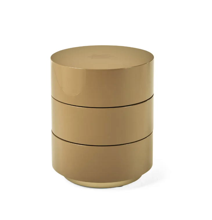 The Tiered Table by Etro Home is a round table with two rotating drawers. Finished in the collection's lacquers and featuring a microfiber interior, it impresses with its refined character and subtle vintage accents. Dimensions: ø 50 x H 62 cm.