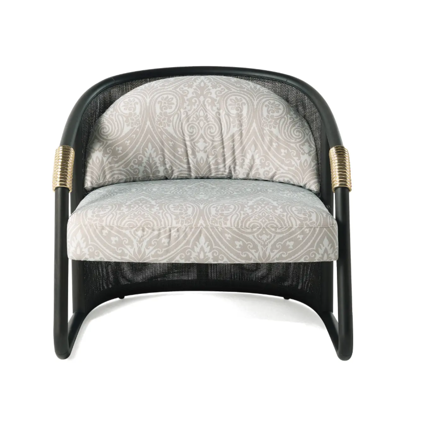 Etro HomeThe Hamar armchair by Etro Home combines the exotic character of rattan with African accents of brass rings. It brings elegance, coziness, and natural charm to any space. Dimensions: L 82 x D 86 x H 75 cm
