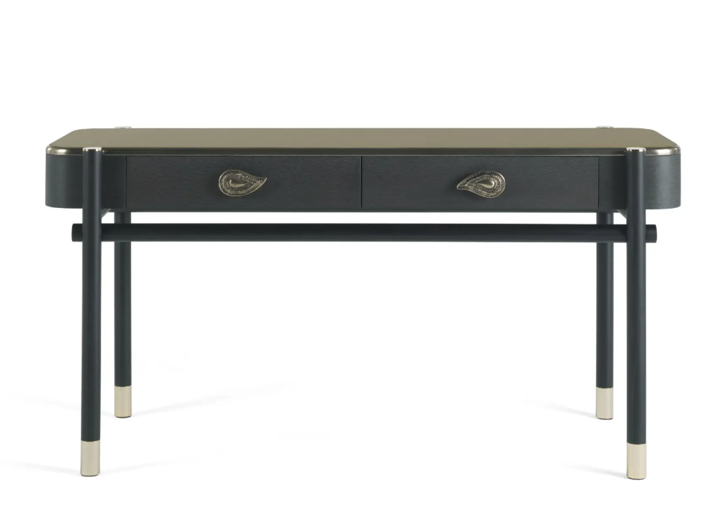 - The Woodstock dressing table by Etro Home features brass finishes, decorative paisley elements, and the deep tones of Carbalho veneer stained matte dark wengé.