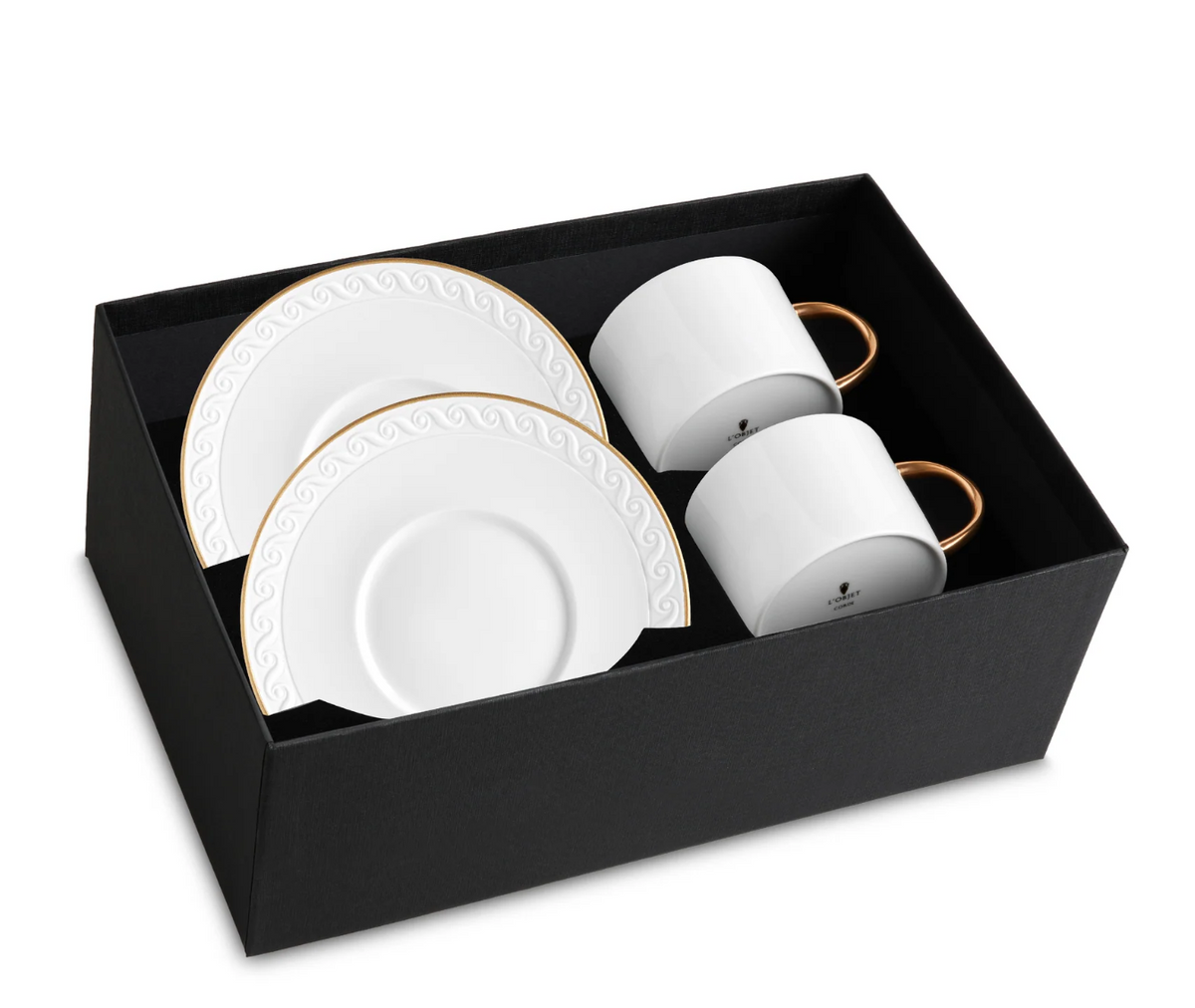 Inspired by the timeless beauty of the sea, this set of two L'Objet teacups from the Neptune collection is handcrafted from fine porcelain. Carved in biscuit and painted with 24-karat gold, it subtly evokes the waves of the Mediterranean Sea.