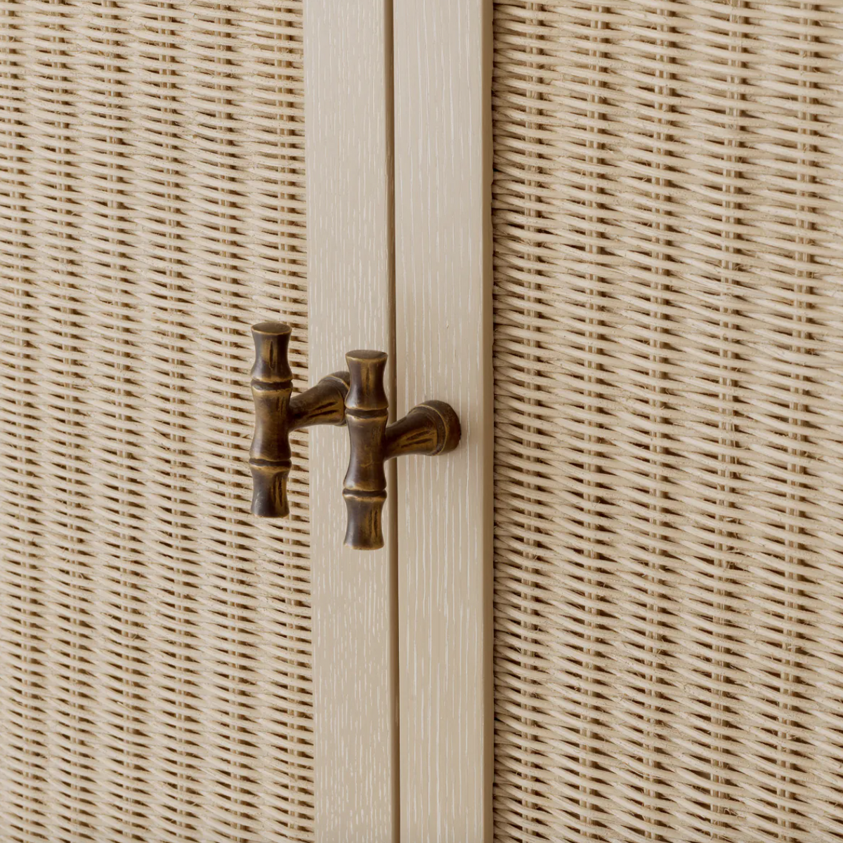 • The Borchard bookcase by Eichholtz is crafted from light-finished oak veneer with delicately woven rattan. Subtle textures and a warm, neutral palette create a harmonious design.