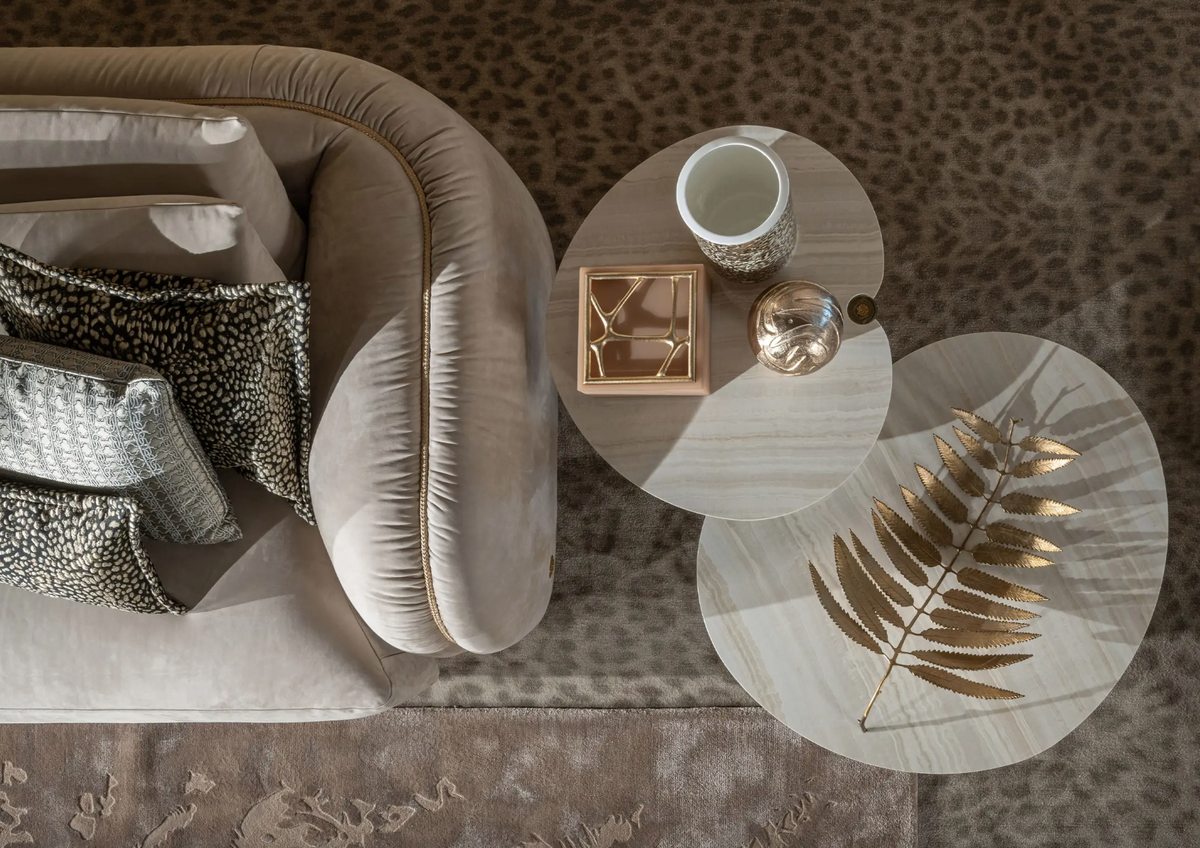 The Paje table by Roberto Cavalli Home Interiors features a metal structure supporting an irregularly shaped tabletop resembling the petal of a water flower. This table will add a poetic touch to any interior. Dimensions: L 108 x W 93 x H 26 cm