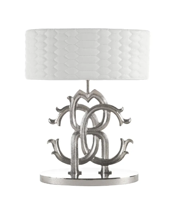 - Roberto Cavalli Home Interiors Logo Table Lamp with a cast brass structure, RC monogram, and silver base. Shade available in black/ivory fabric or diamond-cut leather with hexagonal quilting.