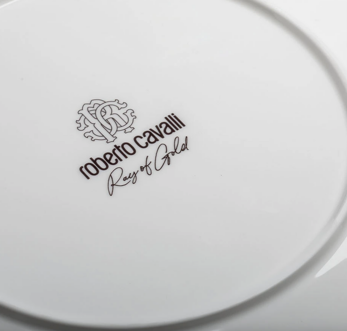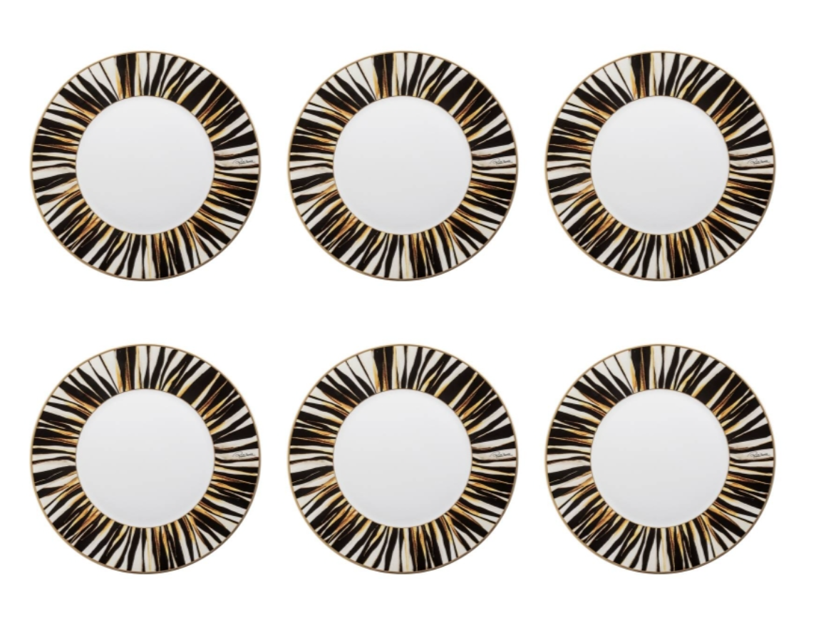 - A set of six Roberto Cavalli Home dinner plates from the Ray of Gold collection, crafted from durable bone china. An elegant, animal-print design with a black and gold rim. Luxurious style for everyday use and special occasions. Capacity: 27.5 cm.