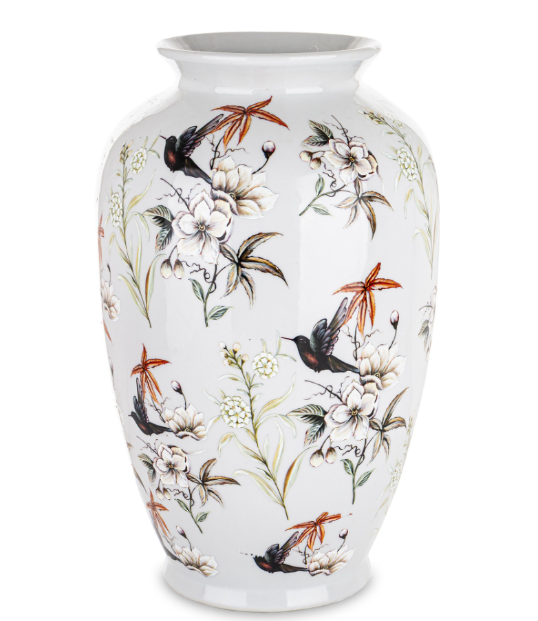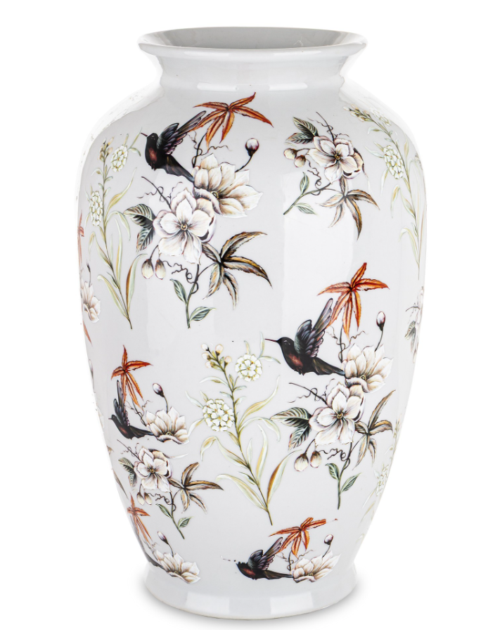 - The White Garden Vase delights with its subtle elegance and delicate floral and bird motifs. The white ceramic combined with painterly details creates a harmonious, romantic composition.