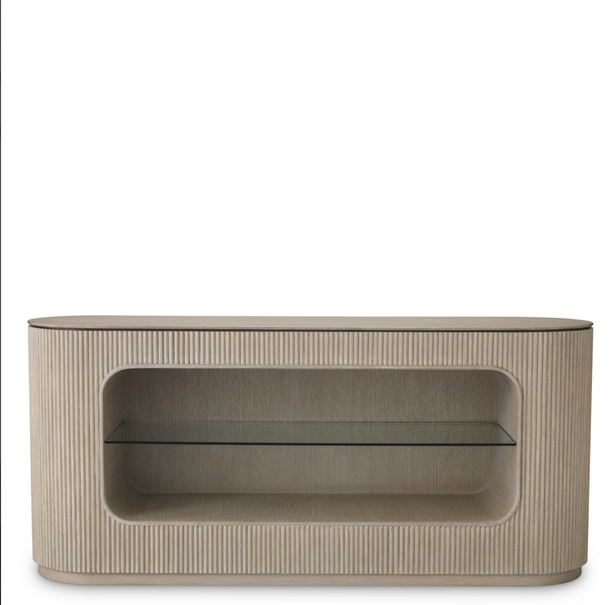 The Eichholtz Bogota sideboard, crafted from washed oak veneer with grooved solid wood panels, brings a modern texture and timeless design to any interior. Dimensions: W 180 cm | D 45 cm | H 79 cm