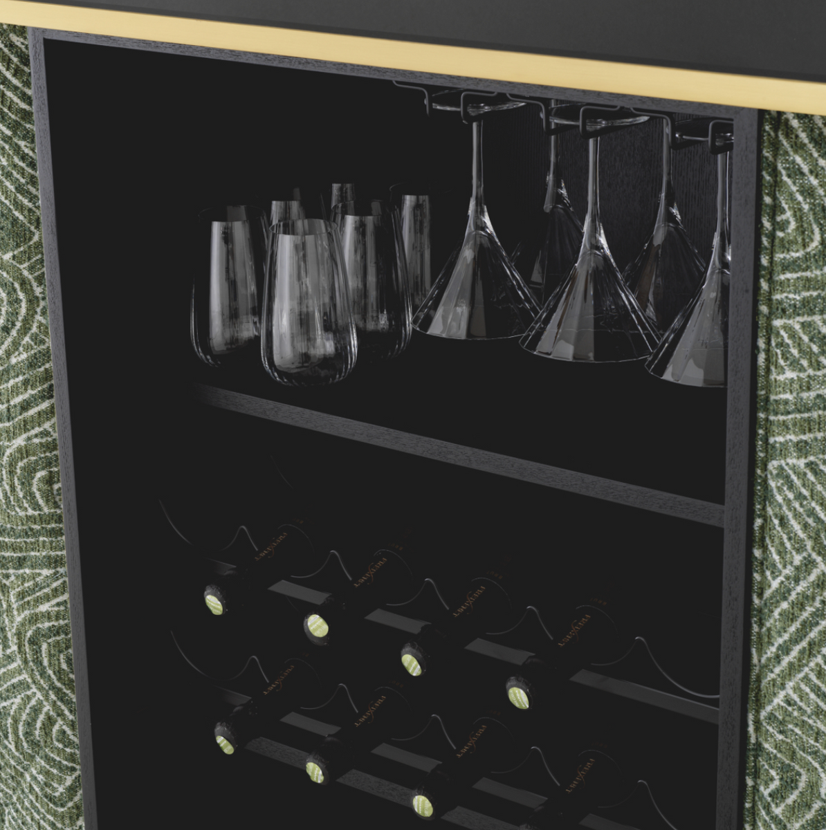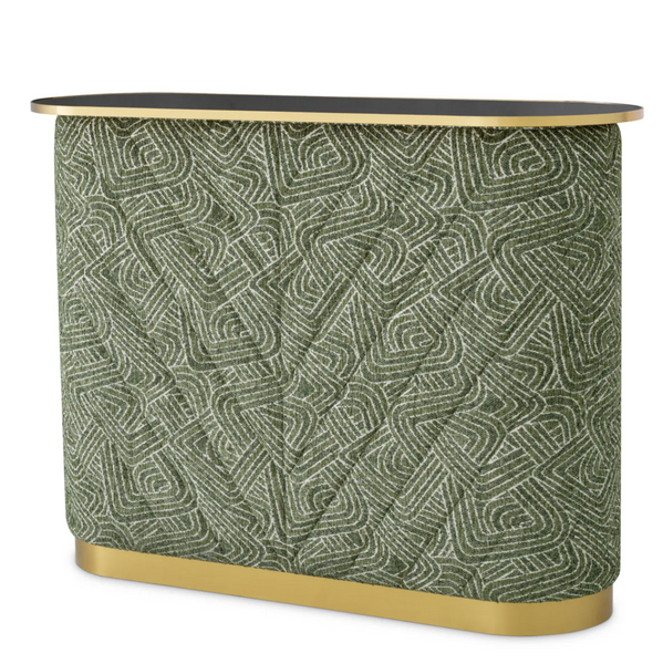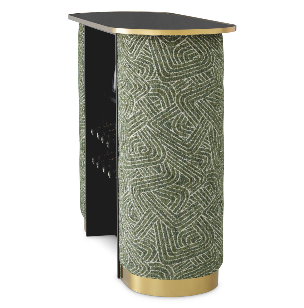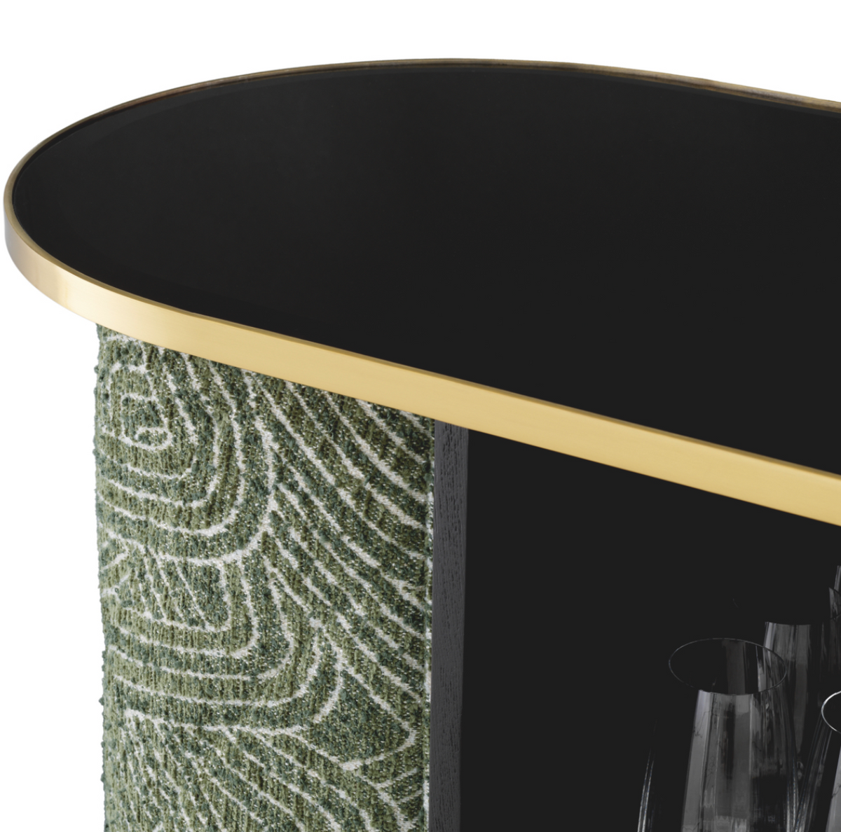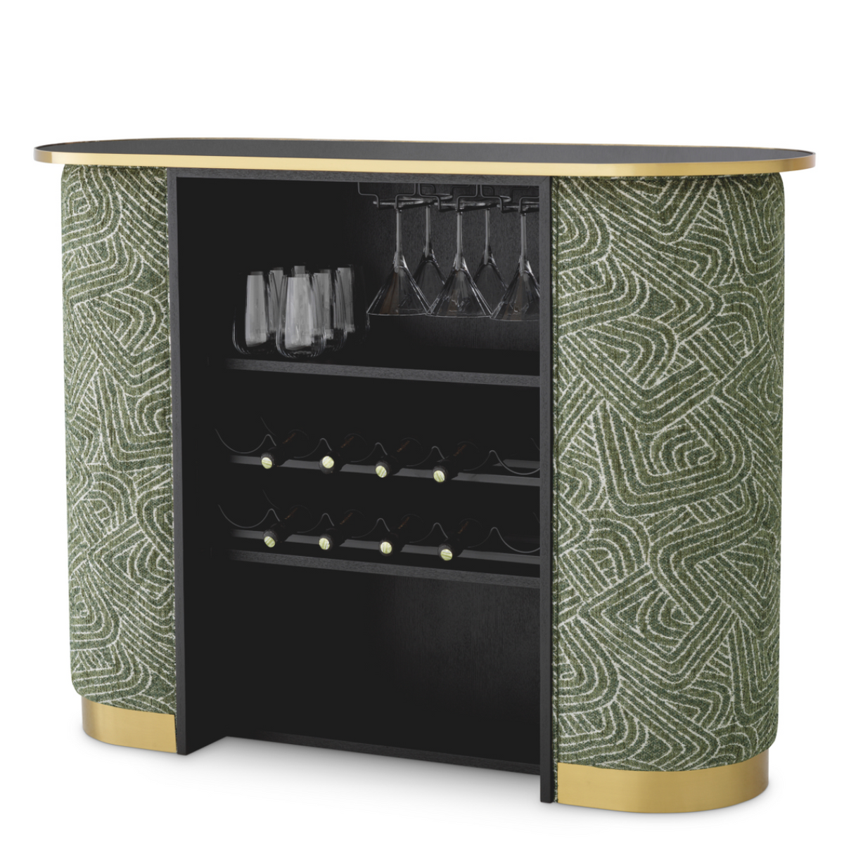 - The Matthew bar by Eichholtz is a luxurious piece of furniture that impresses with its elegance and functionality. Upholstered in Camari Green fabric, with a brushed brass finish and a black glass top.