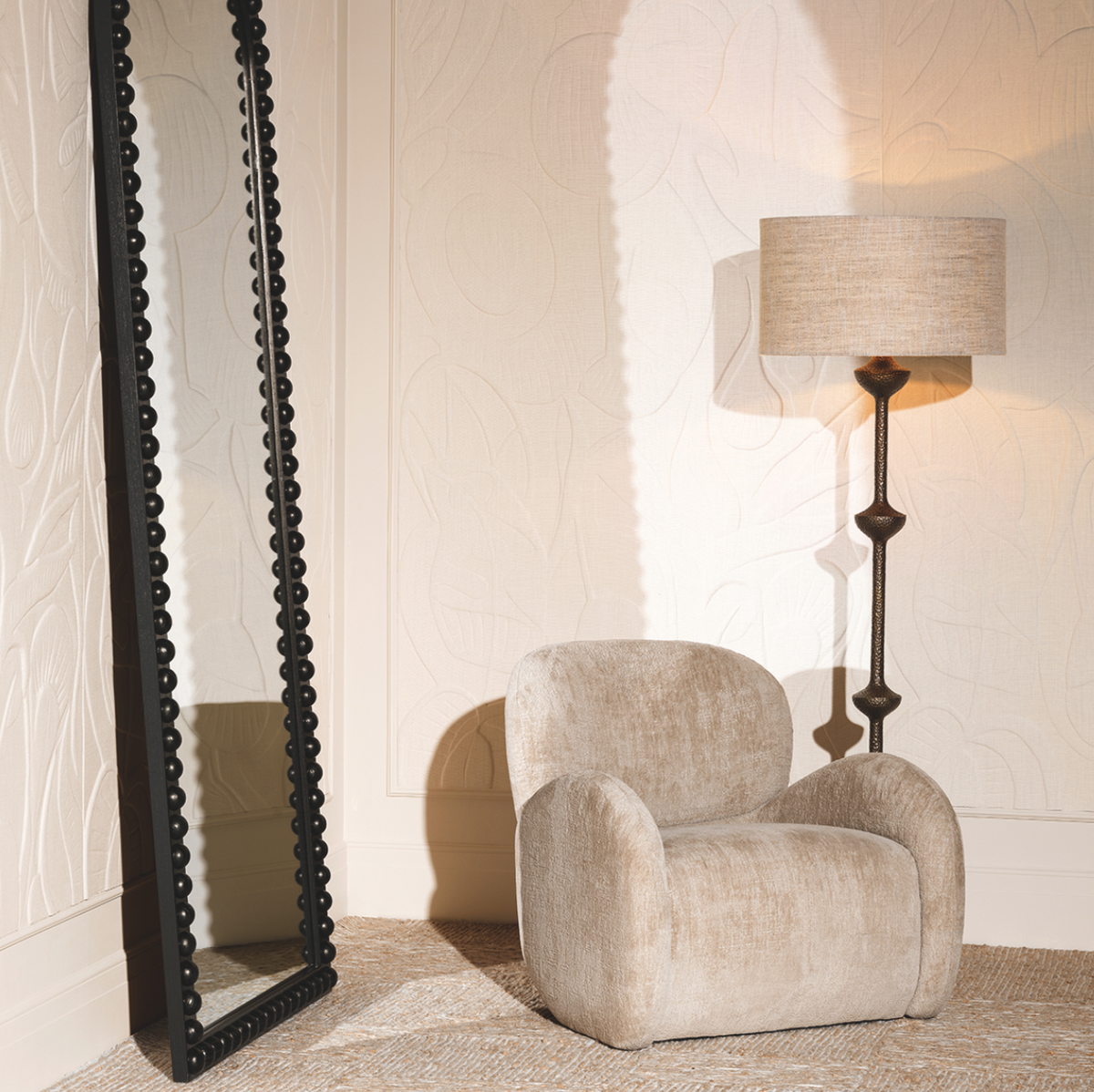 • The Lucente floor lamp from Eichholtz adds an elegant touch of vintage style. The hand-cast base in an antique brass finish and neutral cylindrical shade create atmospheric lighting.
