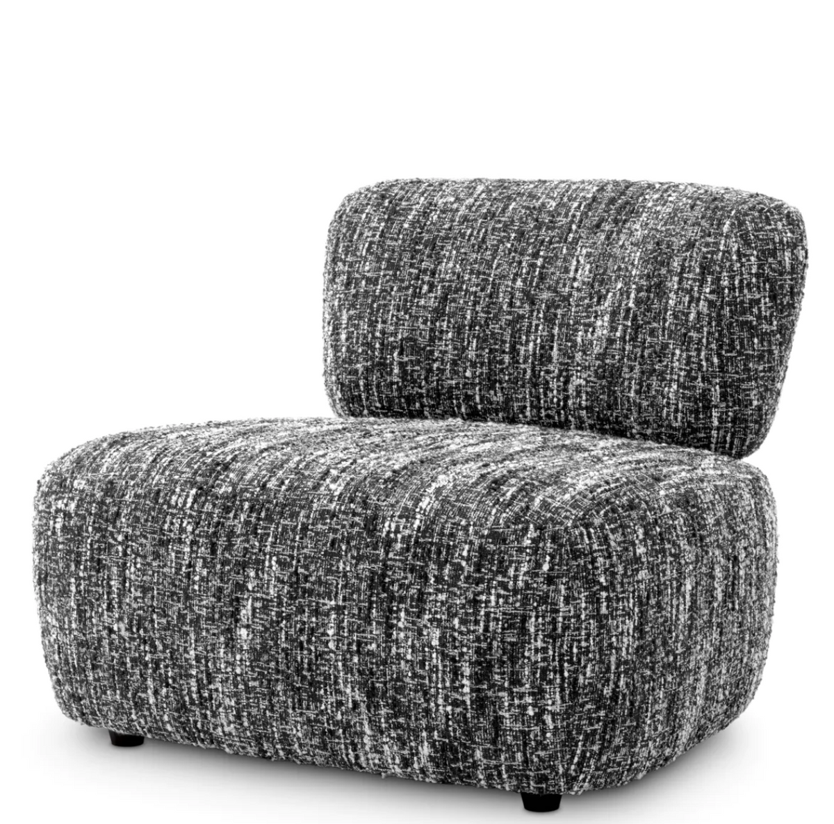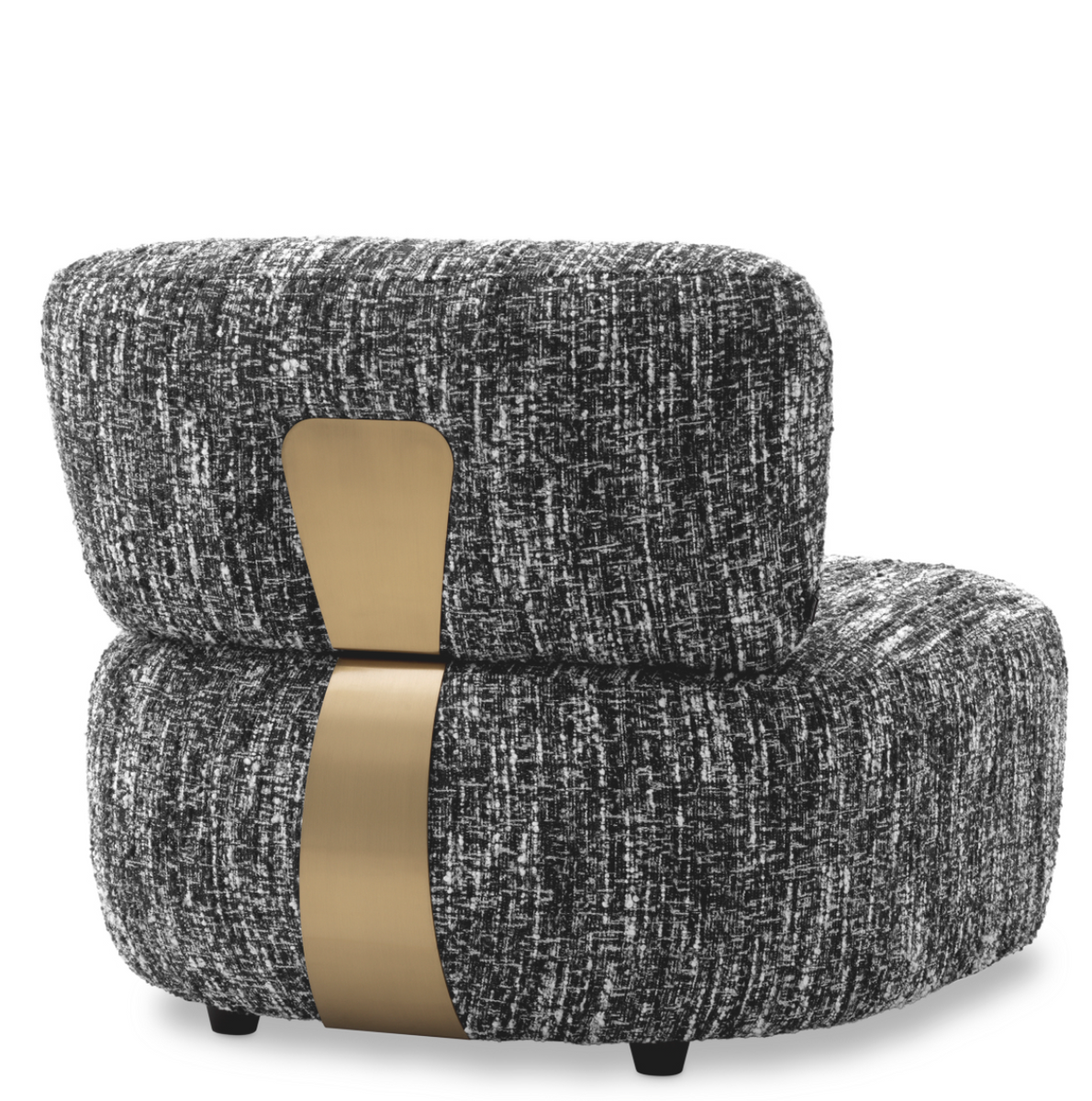 - Leon armchair by Eichholtz upholstered in black Sonata bouclé fabric, with elegant brushed brass detail on the backrest. Dimensions: W. 85 | D. 87 | H. 72 | SD. 62 | SH. 41.5 cm