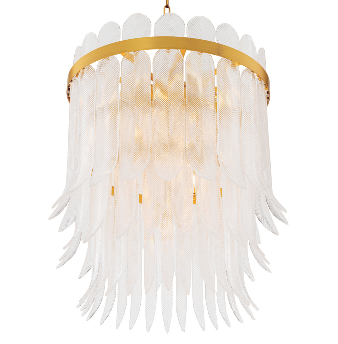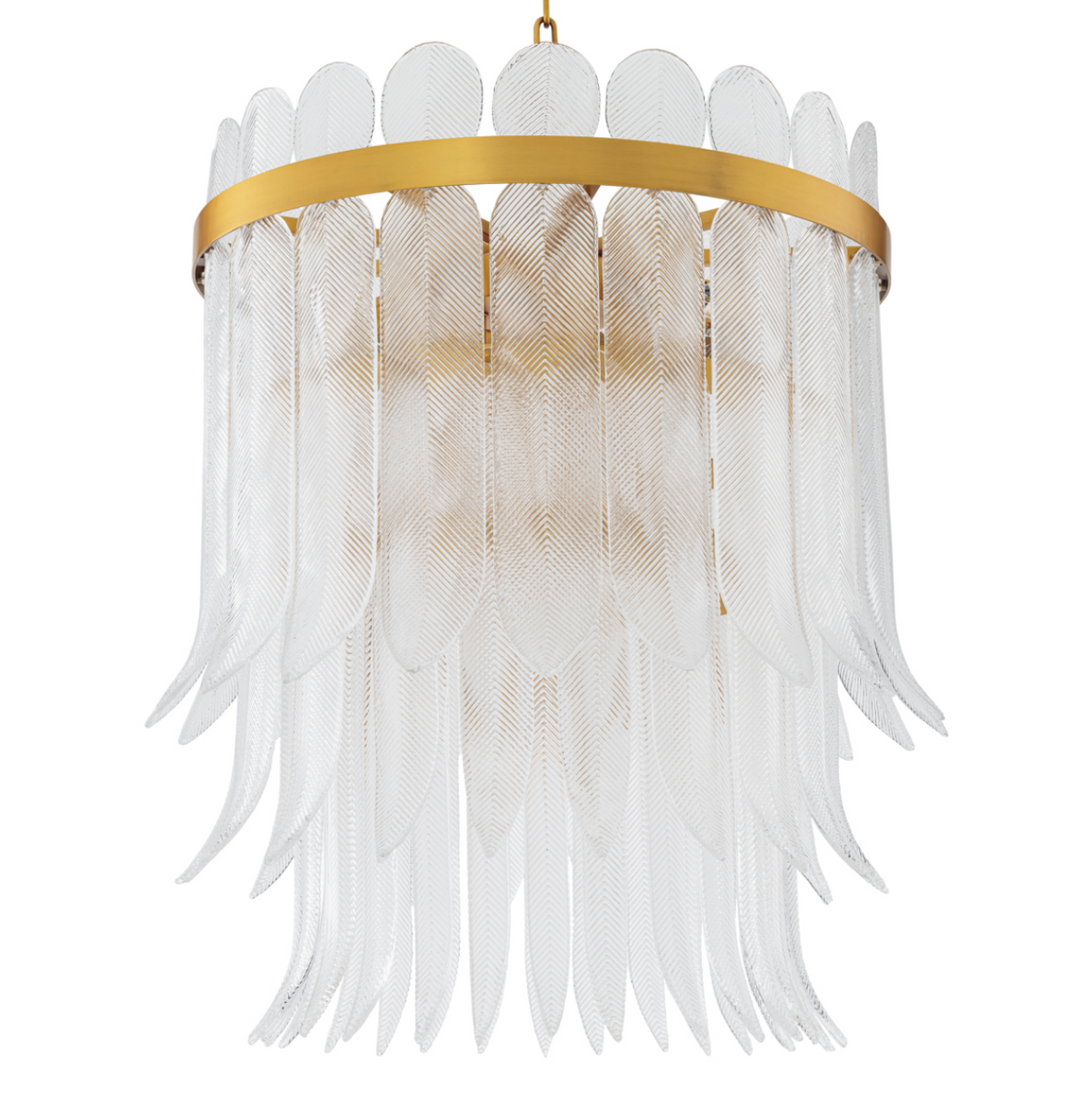 Hand-cast, feather-shaped glass elements subtly shimmer with a delicate iridescence and form a cascading, dynamic composition, reminiscent of fans and ornate headpieces from the flapper era. The delicately grooved texture of the glass resembles embroidery or metallic thread, transforming the light into a soft, luxurious glow.