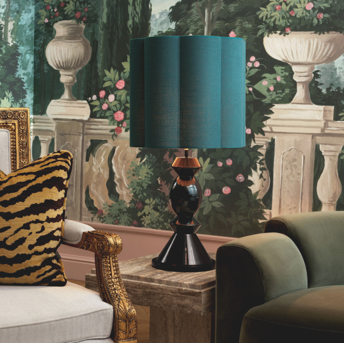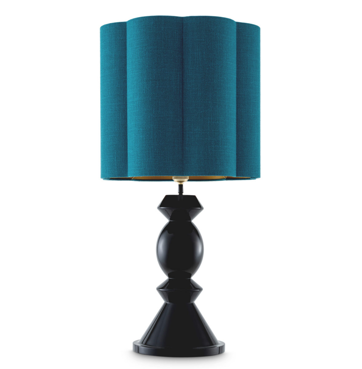 The Dionne table lamp by Eichholtz combines classic geometry with modern sophistication. The sculptural base, composed of spherical and conical shapes, is finished in a high-gloss piano black, giving it a luxurious feel. The turquoise, pleated fabric shade subtly diffuses light, introducing a warm, decorative glow to the interior. The contrast between the deep black base and the intense color of the shade highlights the lamp's timeless elegance, making it a striking addition to stylish, modern interiors. Dimensions: W 13 | W 45 | H 85 cm
