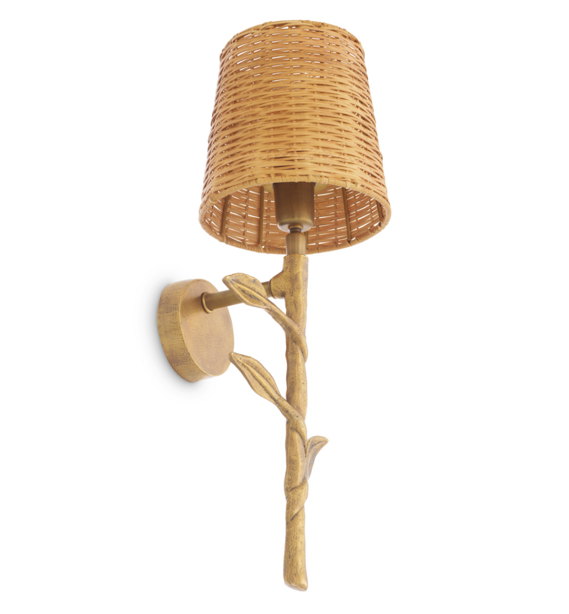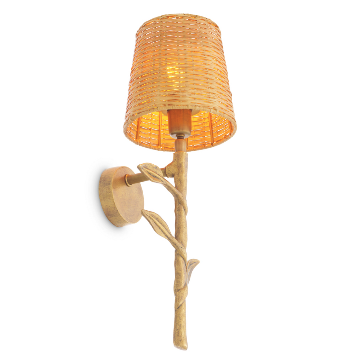 • The Farini wall lamp by Eichholtz combines the natural charm of rattan with the elegance of a vintage brass finish. Its decorative twig design creates a warm, atmospheric light and a stylish accent for cozy interiors.