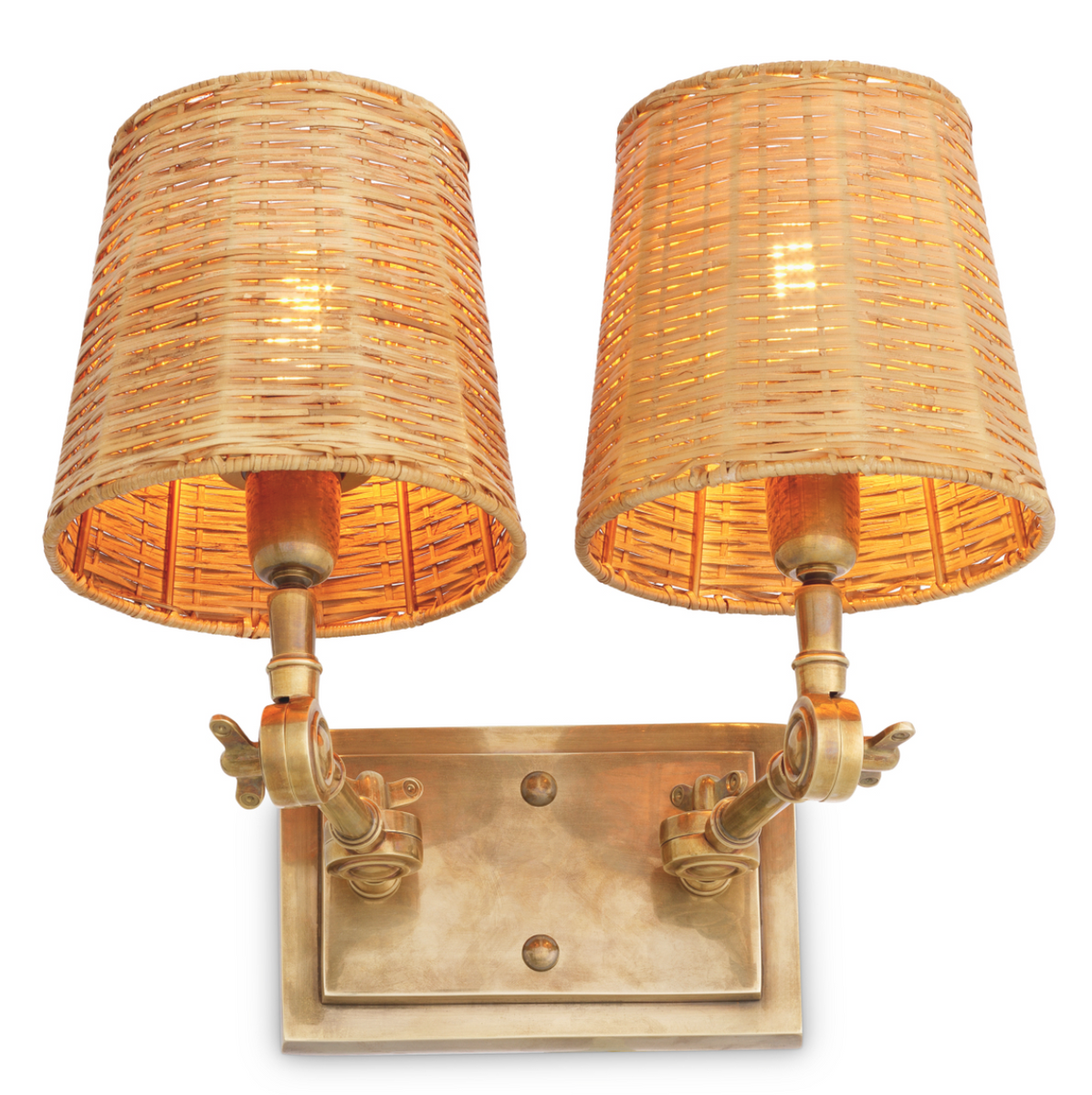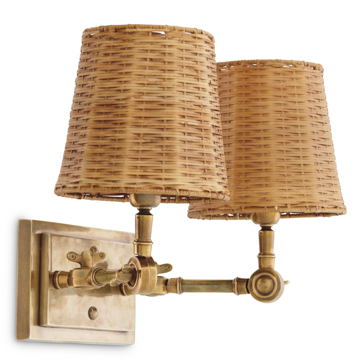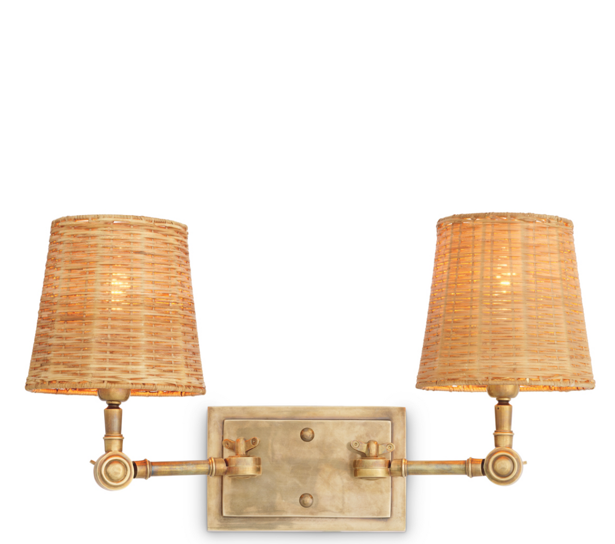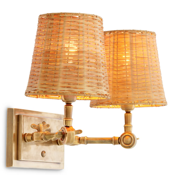 - The Wentworth Double Wall Lamp by Eichholtz is an elegant wall lamp inspired by the style of boutique hotels. Its two adjustable arms and rattan shades, combined with a vintage brass finish, create a functional and decorative accent.