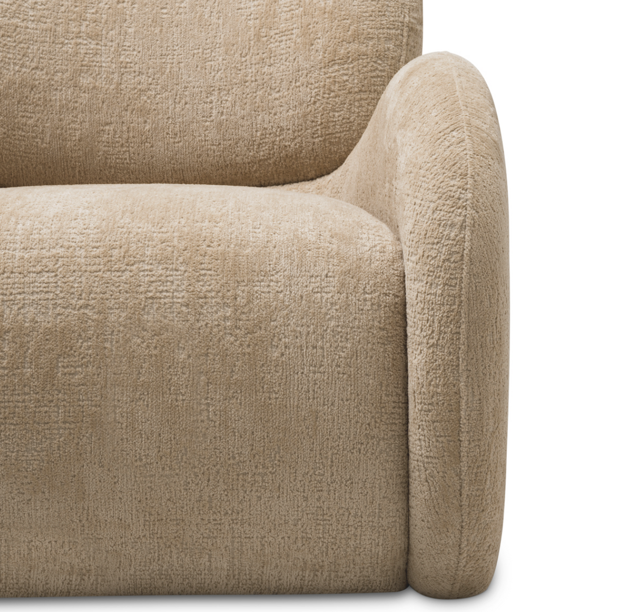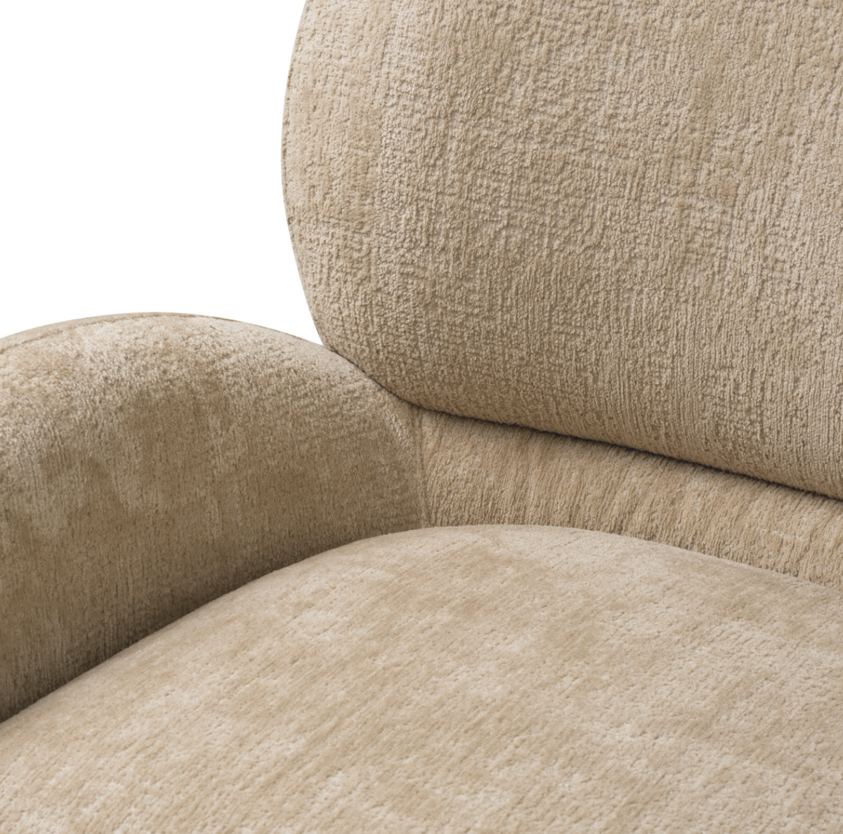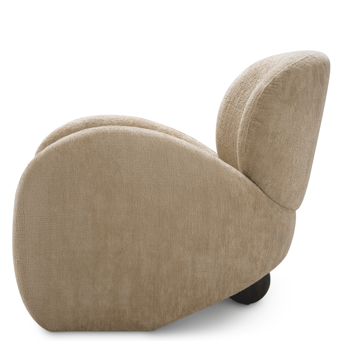 The Sylval armchair by Eichholtz is a sophisticated choice for modern interiors. Upholstered in the new Avelin sand fabric, it boasts a soft, rich texture that brings a touch of subtle luxury to the space. A distinctive detail is the decorative wooden ball placed on the back of the armchair, emphasizing its designer character. The neutral color scheme makes the armchair easy to coordinate with other colors and furnishings, perfectly suited to a living room, bedroom, or lounge area. Dimensions: W. 82 | D. 89 | H. 76 | SD. 63 | SW. 53 | SH. 42 | AH. 54.5 cm