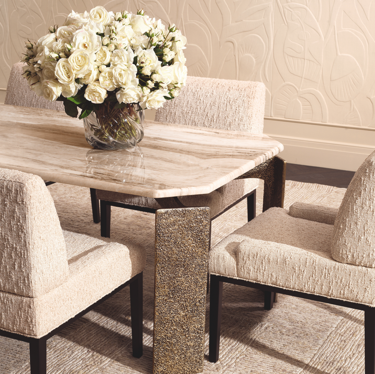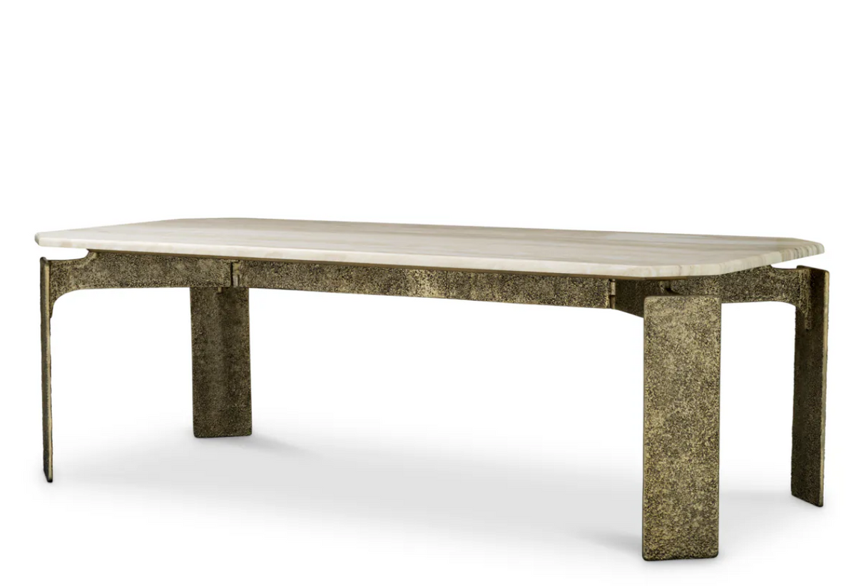 • The rectangular Bodega dining table by Eichholtz features a sculptural form with an antique brass base and a beige marble top. The noble materials lend the interior elegance and a timeless character.