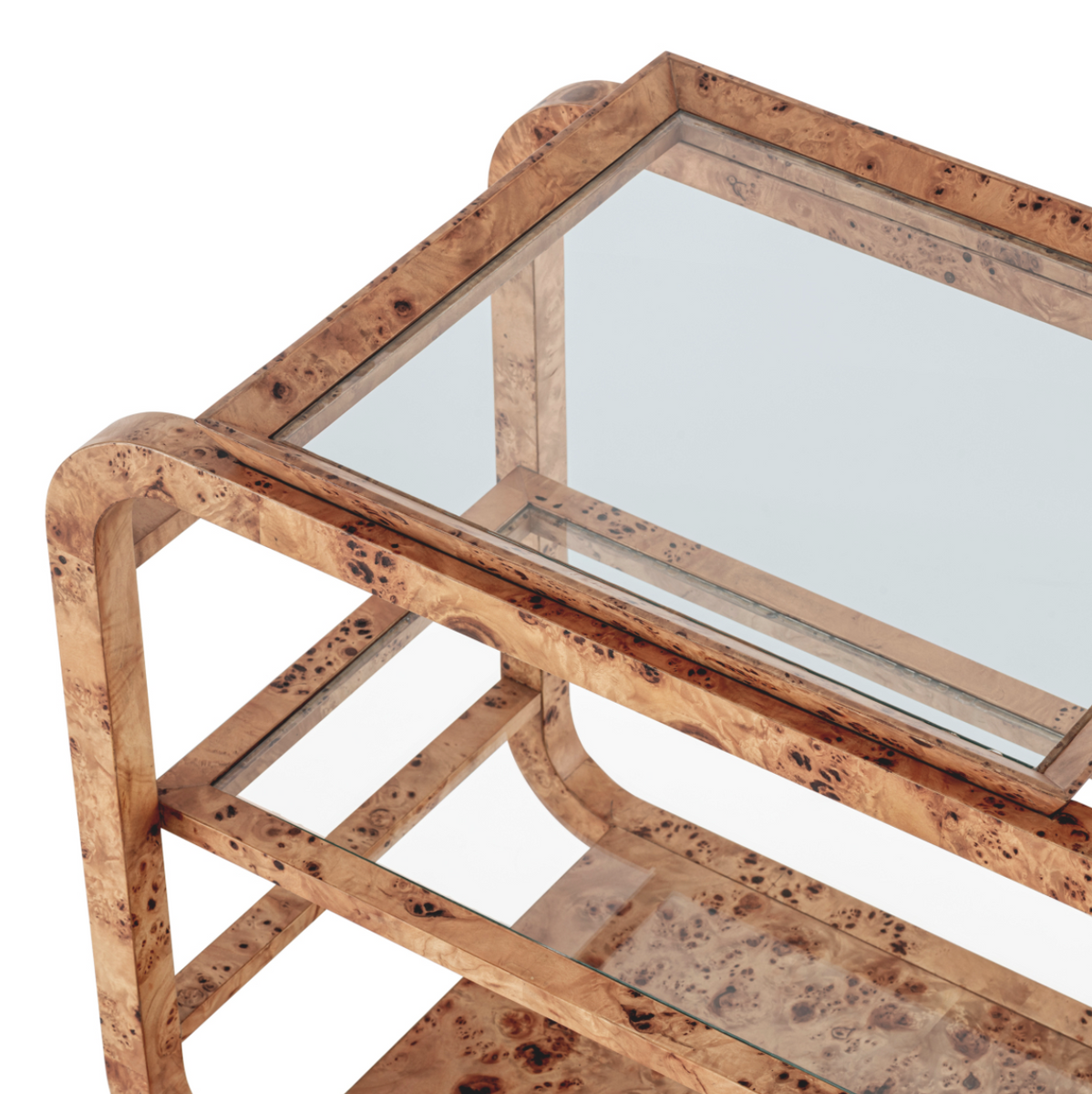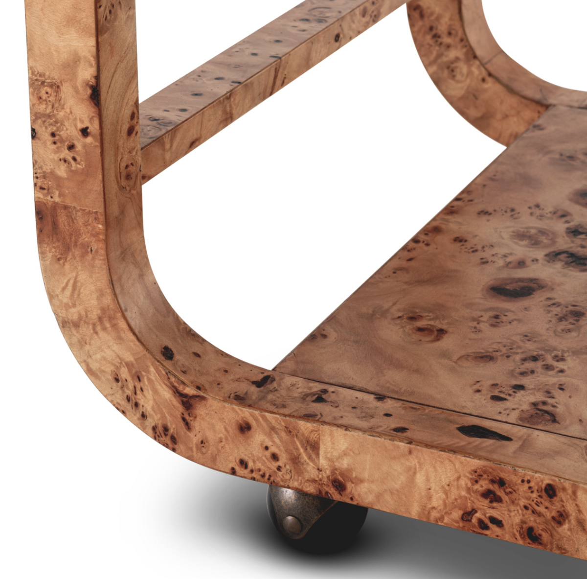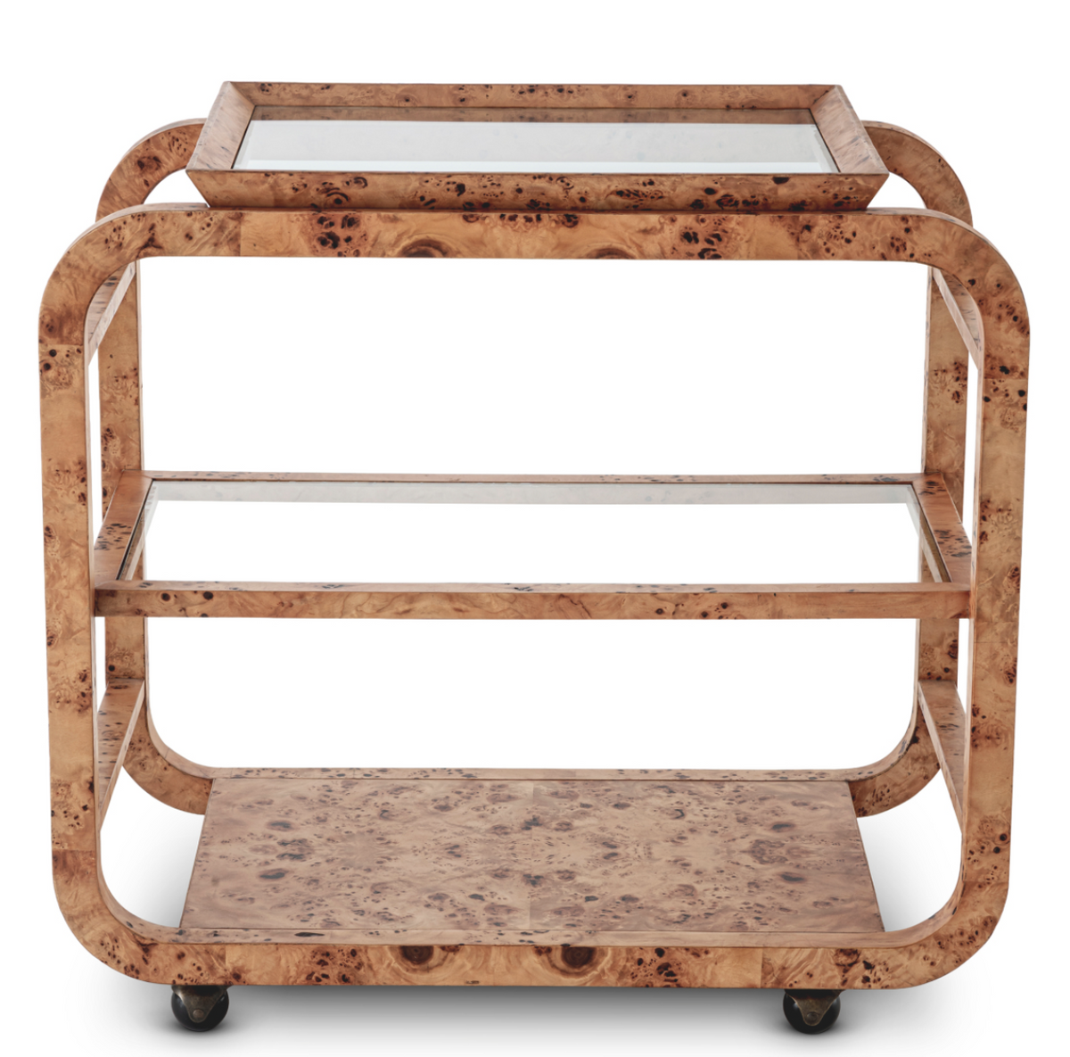 • The Eichholtz Mayfair trolley, crafted from light brown Mappa Burl veneer, combines classic elegance with functionality. A removable tray and wheels ensure ease of use and mobility.