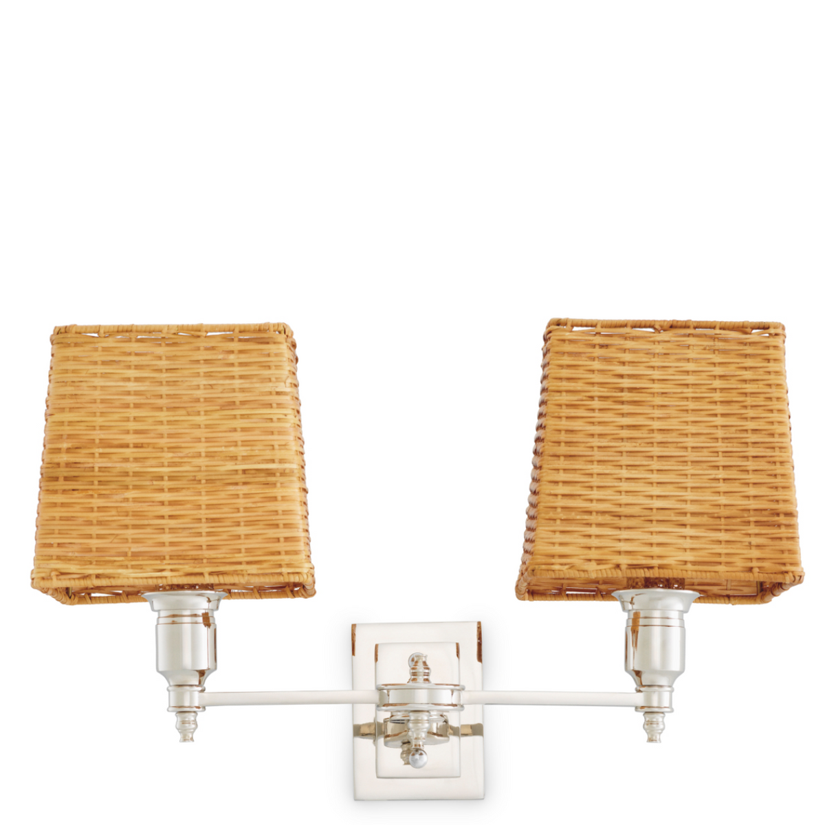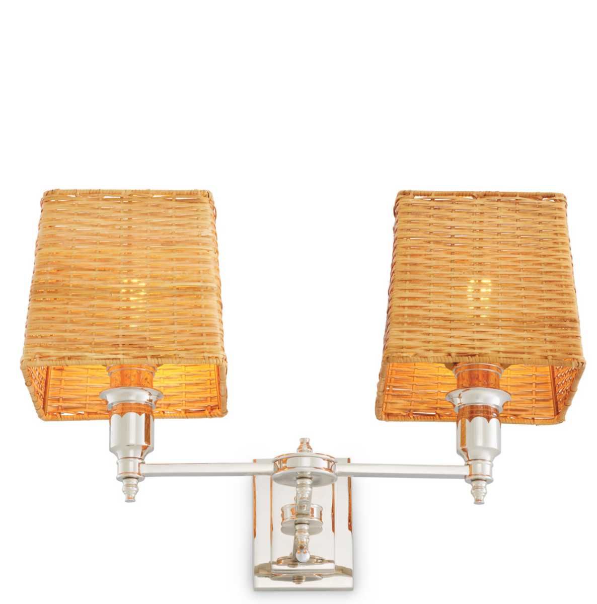• The Lexington Double wall lamp from Eichholtz elegantly combines a nickel-finished frame with natural rattan shades. The subtle gleam of the metal and the light form bring a timeless charm to any interior. Dimensions: W 40 cm | D 23 cm | H 27 cm