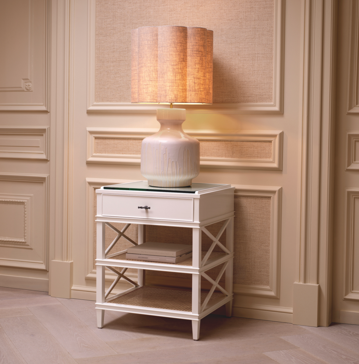 - The Lorena table lamp by Eichholtz features a stunning ceramic base with a white glazed effect. The linen shade and antique brass details give it an elegant, timeless character.
