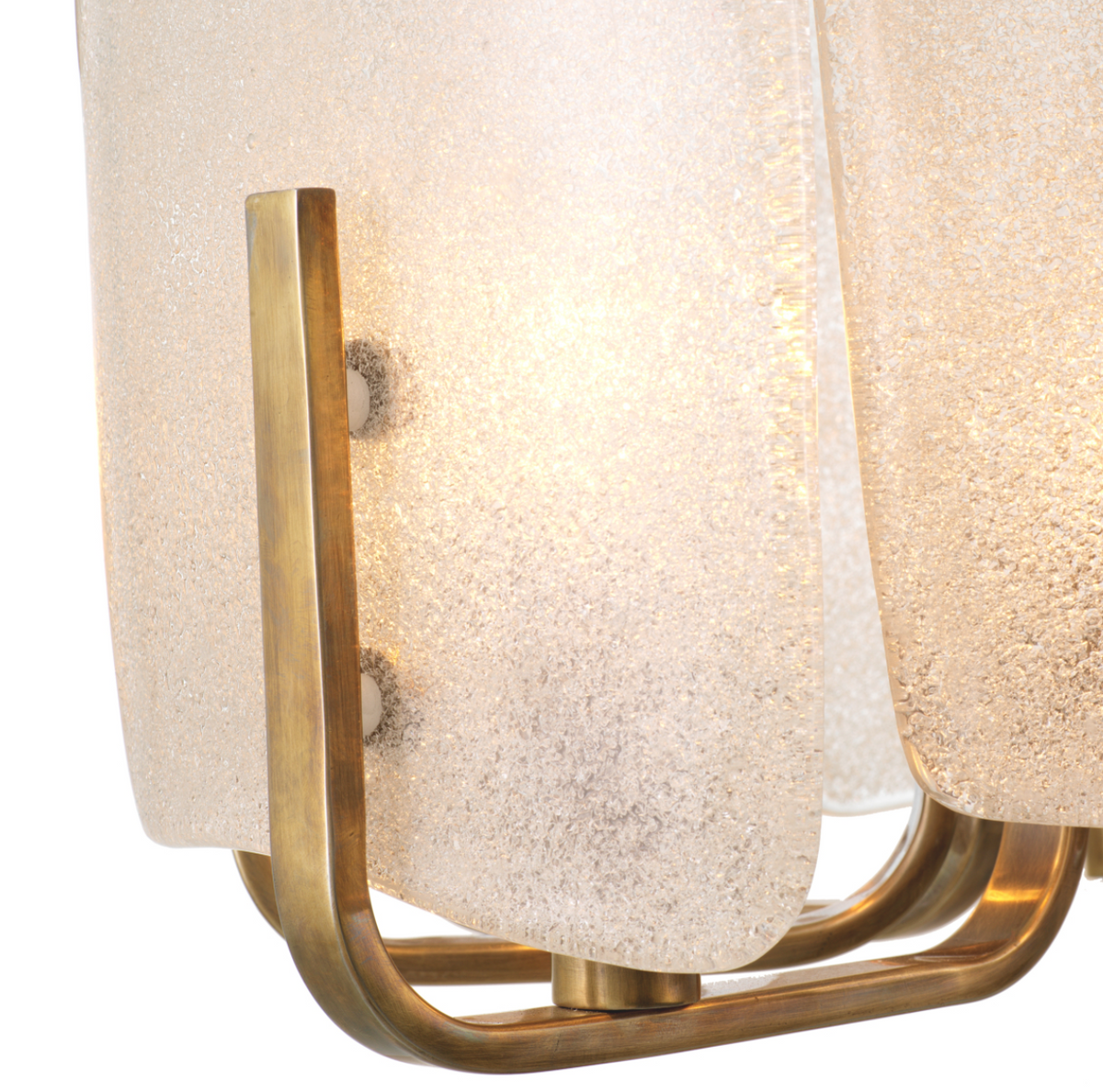 • The Serrano chandelier by Eichholtz is an elegant combination of handcrafted glass and a vintage brass finish. Its timeless design and refined materials make it a luxurious accent for any interior.