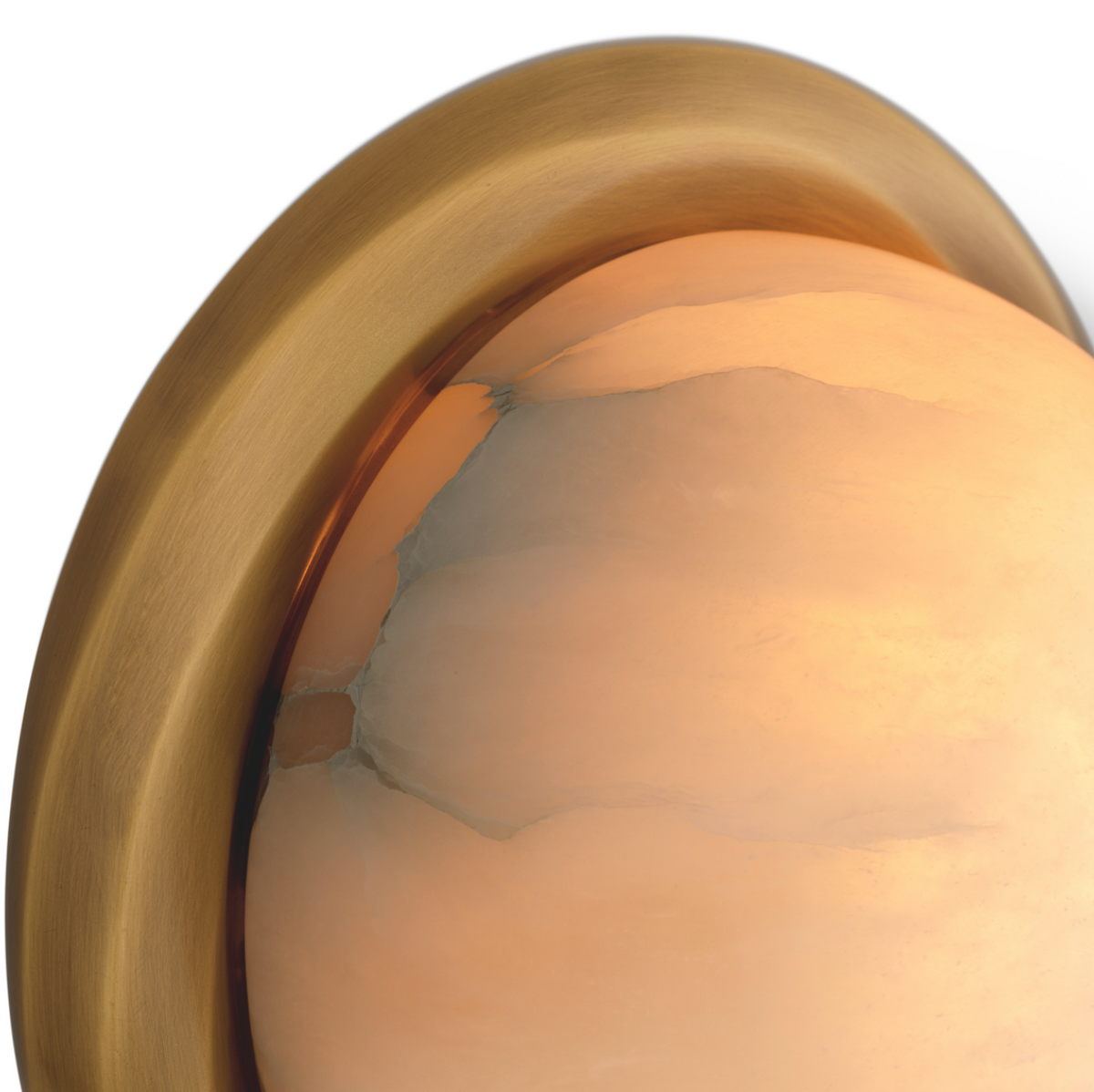 • The Vigo wall lamp by Eichholtz is a round wall lamp crafted from alabaster and finished in an antique brass shade. It emits a soft, warm light, adding elegance and a timeless character to any interior.
