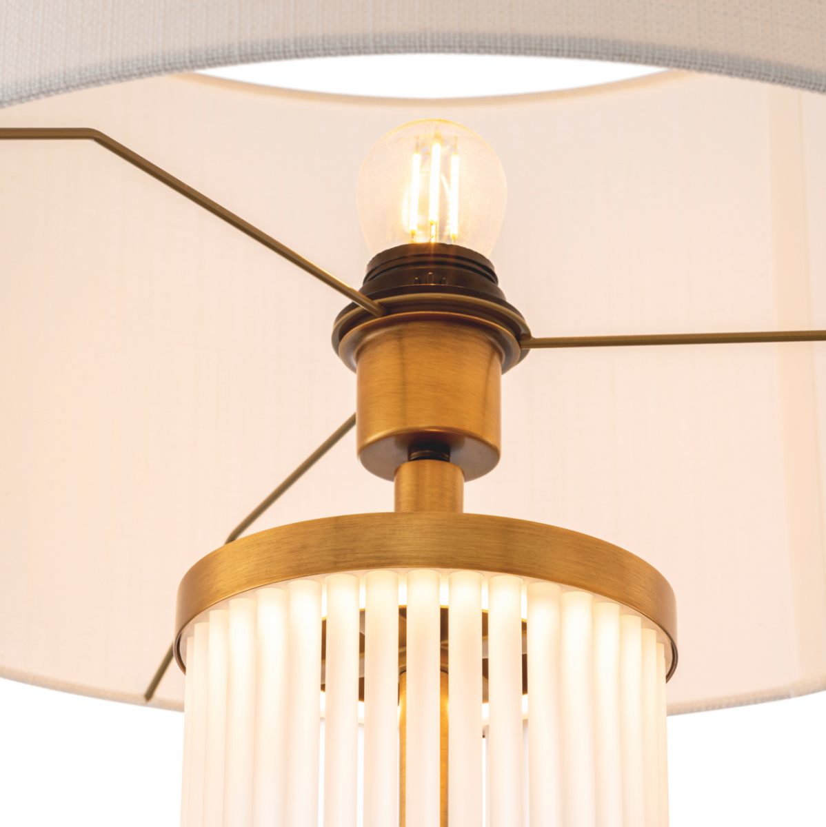 - The Thibaud table lamp from Eichholtz impresses with its antique brass finish and frosted glass. Additional dimmable lighting in the base creates a warm, atmospheric atmosphere.
