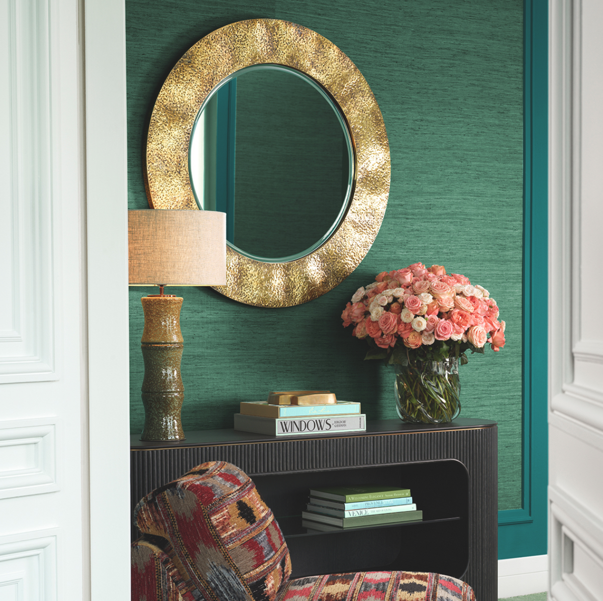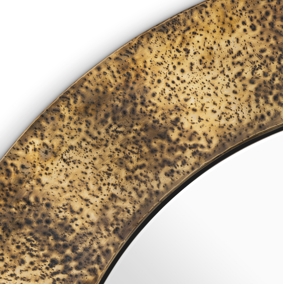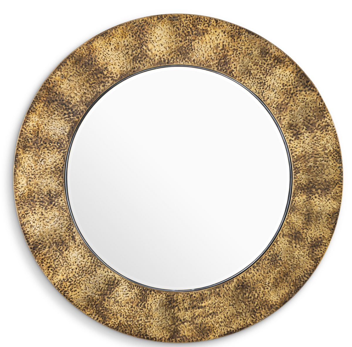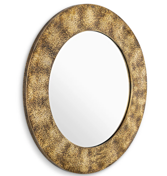 - The Ronin mirror by Eichholtz boasts a hand-hammered vintage brass finish. Subtle, organic recesses and a warm gold patina give it a sculptural, elegant character. Dimensions: Ø 110 cm | depth 3.5 cm