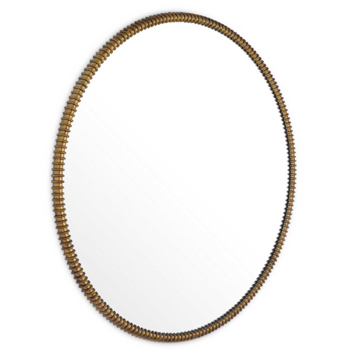 - The Vezzola mirror by Eichholtz features a striking, round design with a handcrafted aluminum frame. Its vintage brass finish enhances its elegant character and makes it a stylish accent for any interior.