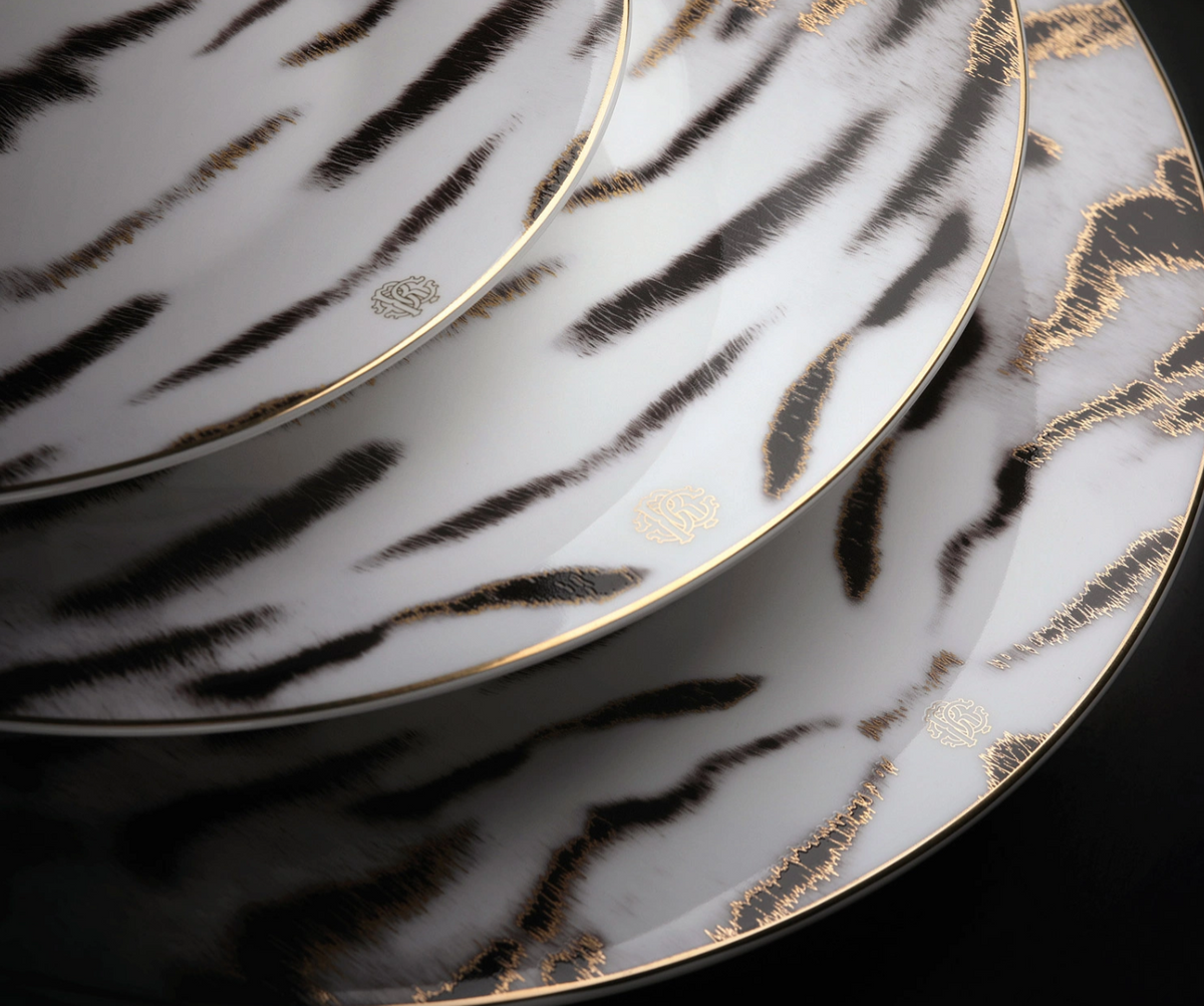 - A set of six Roberto Cavalli Home soup plates from the Tiger collection. Crafted from high-quality porcelain, they feature a stunning tiger motif on a white background, black stripes, and gold details. Perfect for luxurious table settings.
