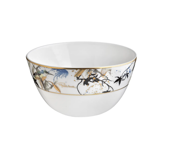 A set of six rice bowls from the Garden's Birds collection by Roberto Cavalli Home. Crafted from high-quality porcelain, these bowls are distinguished by their unique, timeless style. The decorations resemble artistic paintings, depicting birds as if on canvas, complemented by subtle gold accents. The gold-finished edges and details are a distinctive hallmark of the Roberto Cavalli Home brand and emphasize the luxurious character of the collection. The bowls are perfect for elegant table settings. Dimensions: Ø 11.3 x H 6 cm.