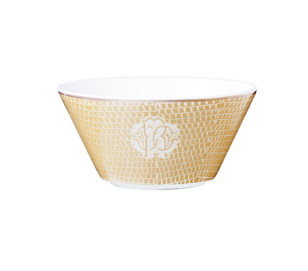 A set of six Roberto Cavalli Home fruit bowls from the Lizzard Gold collection. Crafted from high-quality porcelain, these bowls are part of a refined and elegant collection inspired by the natural texture of reptile skin. The beige finish with a subtle gold effect lends a luxurious touch, while the gold rim accents the elegant form of the bowls. The white Roberto Cavalli Home monogram, present on all pieces in the collection, contrasts with the decoration and provides a distinctive, recognizable touch of the brand. These bowls make an ideal elegant tabletop accent. Dimensions: Ø 12.8 x H 6.3 cm.