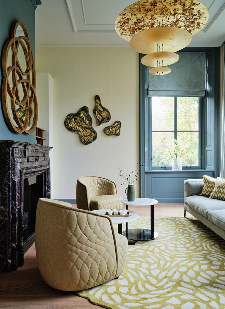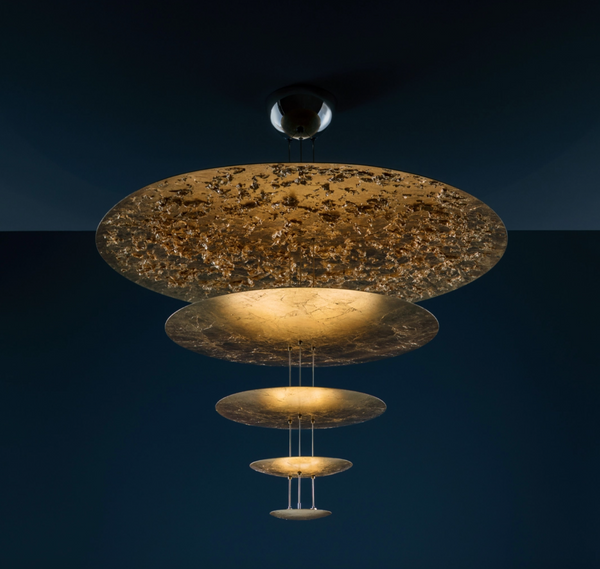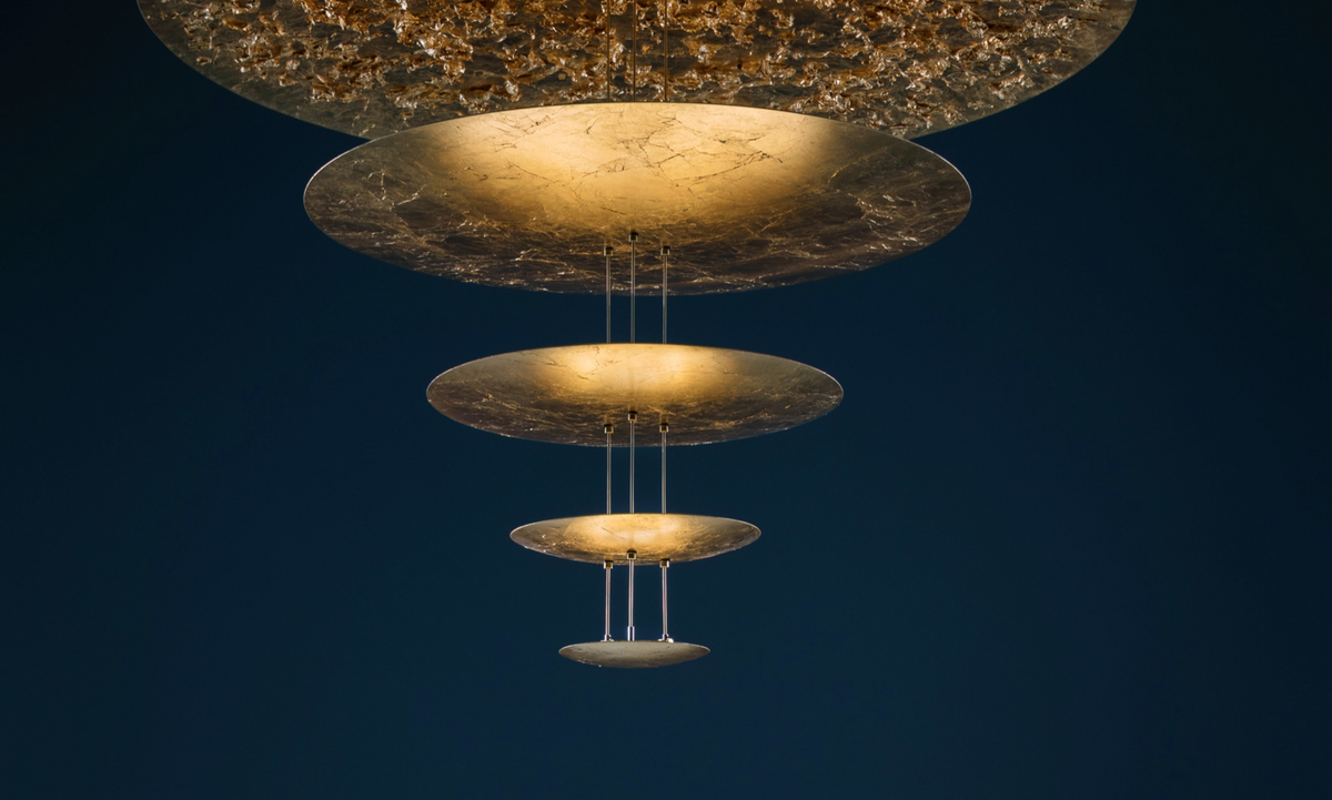 The MDLG model (mod. D) consists of five diffusers of varying diameters, the largest of which, measuring 120 cm in diameter, is finished with a striking flying leaf technique. The gilded surfaces enhance and softly diffuse the light emitted by the integrated LED modules. The structure is complemented by slender brass or aluminum rods and a nickel-plated ceiling base. This lamp is perfect for representative, large-scale interiors. The model is also available in other variants and configurations.