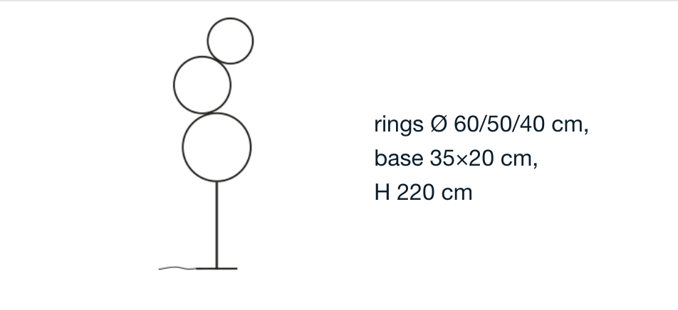 Dimensions: rings Ø 60 / 50 / 40 cm × base 35 × 20 cm × total height 220 cm × 16 LED light points (16 W, 2700 K).