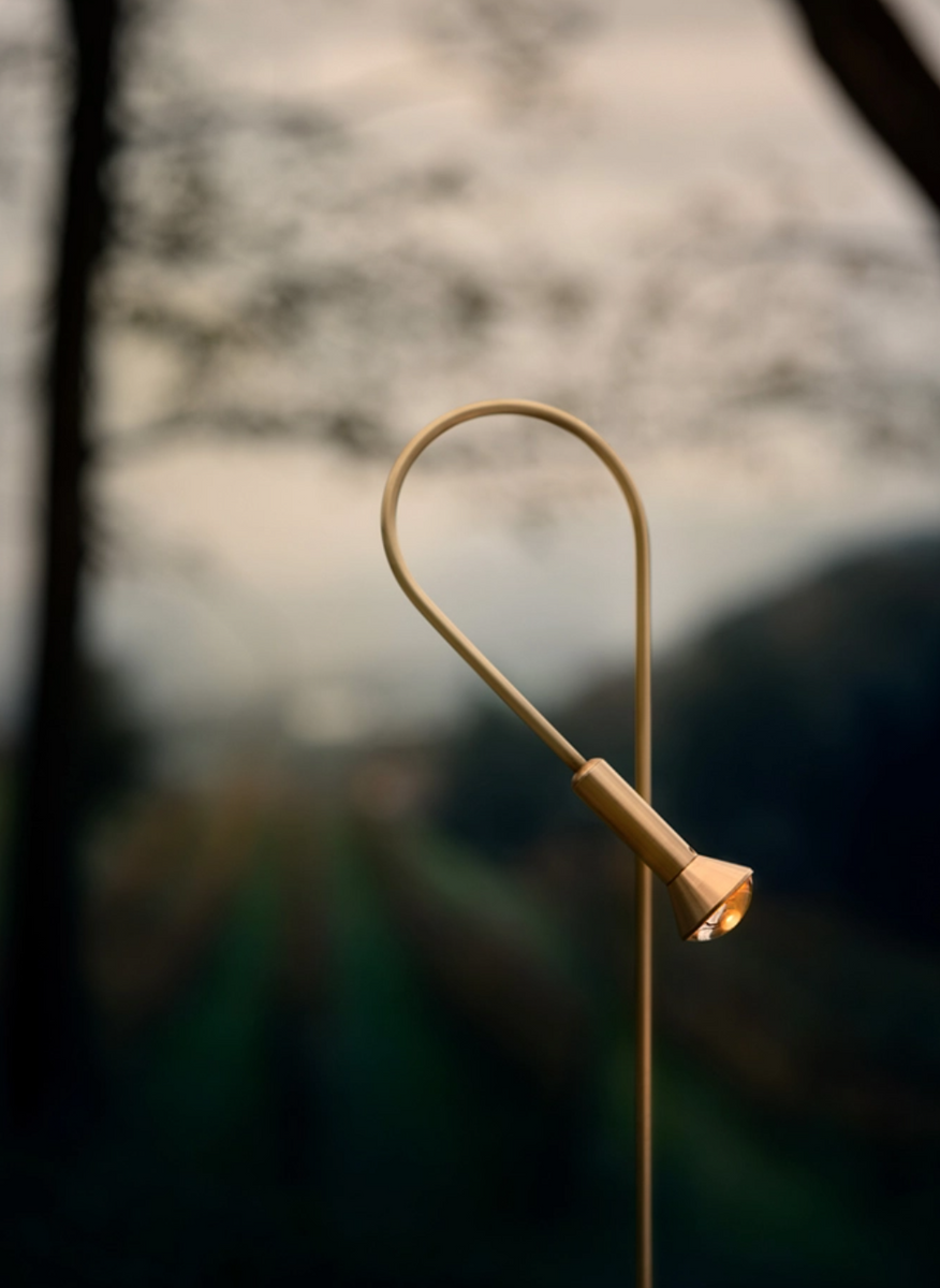 Catellani & SmithThe Syphaduepassi lamp by Catellani & Smith is part of Enzo Catellani's first outdoor lighting collection, designed to naturally extend indoor light into gardens and terraces. The design is distinguished by its extreme simplicity of form, allowing the lamp to blend seamlessly with its surroundings, becoming a discreet element of the landscape. The slender, natural brass stem is topped with a glass lens that gently diffuses warm LED light. The design is adapted for outdoor use while maintaining the ambiance familiar from home lighting. Syphaduepassi is perfect for subtle illumination of paths, flowerbeds, or relaxation areas in the garden.
