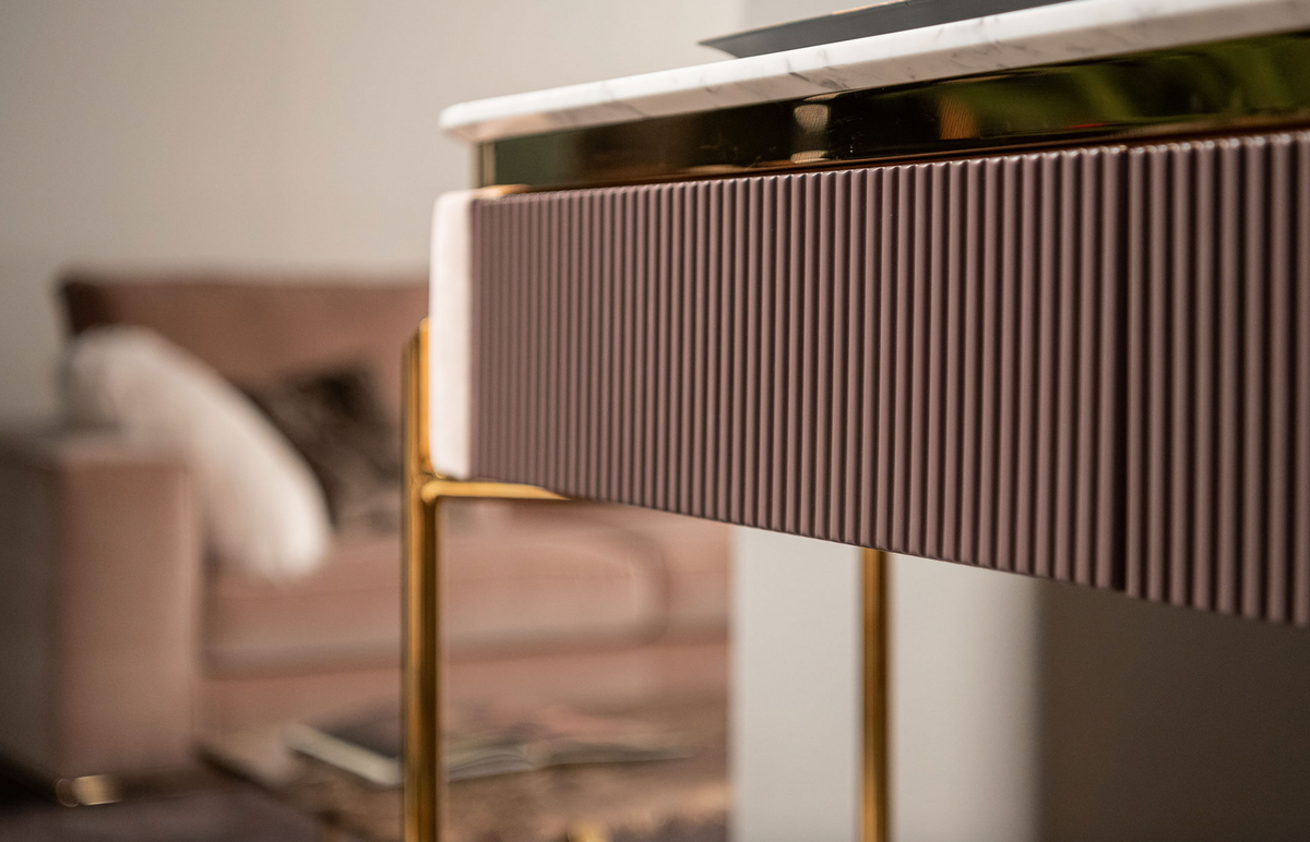 The rounded sides soften the console's shape, emphasizing its modern and decorative character. The wooden drawer fronts feature a relief finish in the form of vertical channels and soft-close runners, ensuring exceptional comfort. The console's sides can be finished in fabric or leather, chosen from a wide range of available materials. The Carrara marble top lends elegance and prestige to the entire piece; versions with a wooden or glass top are also available upon request.