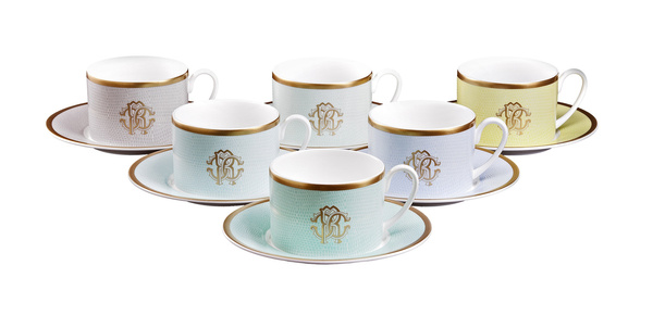 - This set of tea cups by Roberto Cavalli Home, from the Lizzard Sunrise collection with lizard skin texture, was made of high quality Bone China porcelain and plated in 24 karat gold.
