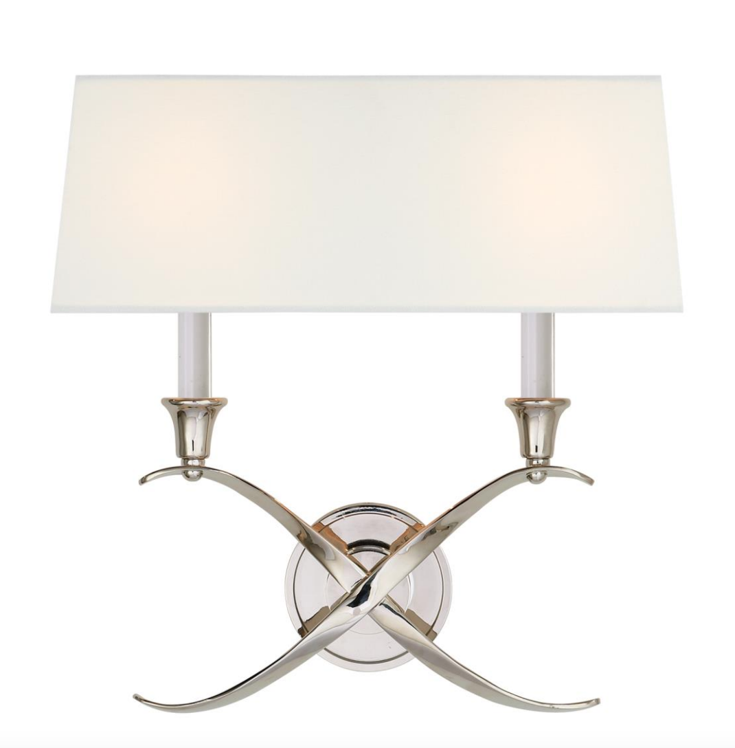 - The Cross Bouillotte Large wall lamp by Chapman & Myers is crafted from high-gloss polished nickel and finished with a double linen shade with two sockets.