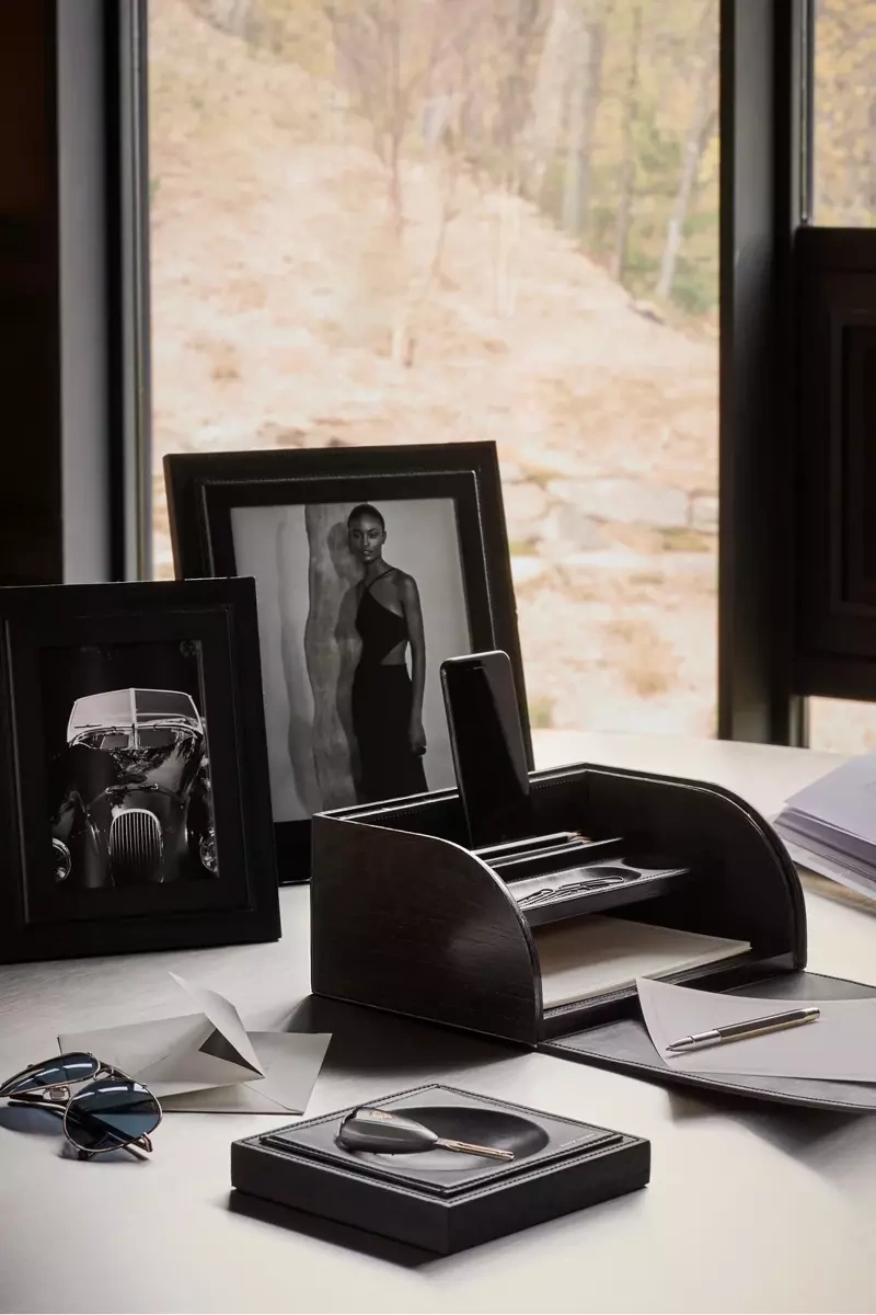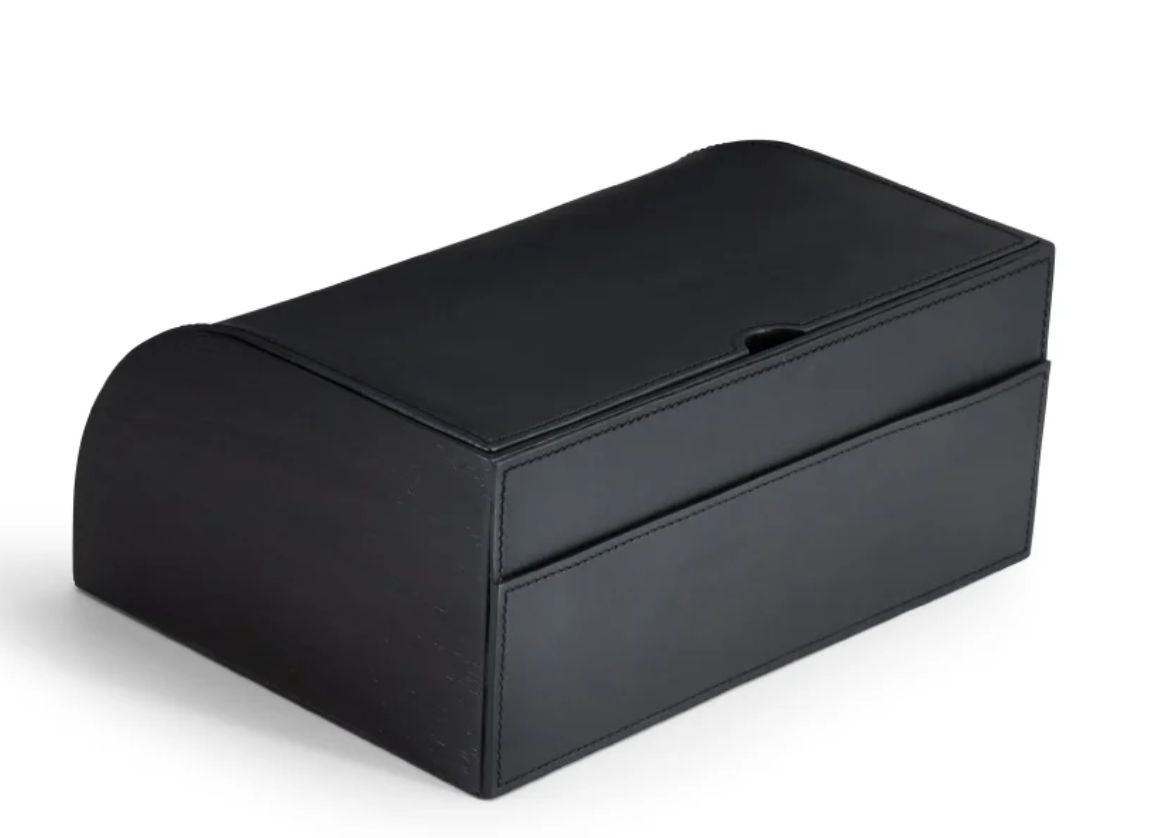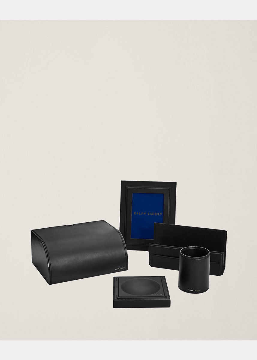 Inspired by Ralph Lauren's fine handbags, this teakwood-and-leather writer's box is the ultimate desk accessory for the modernist who appreciates timeless craftsmanship.