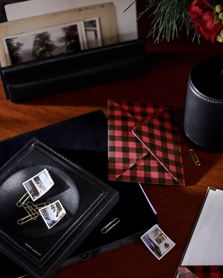 Inspired by Ralph Lauren's fine handbags, this teakwood-and-leather writer's box is the ultimate desk accessory for the modernist who appreciates timeless craftsmanship. Hand-stitched calfskin subtly accentuates its sleek silhouette, and it features a built-in blotter, a tray for writing instruments, and an area for storing stationery and a tablet computer.