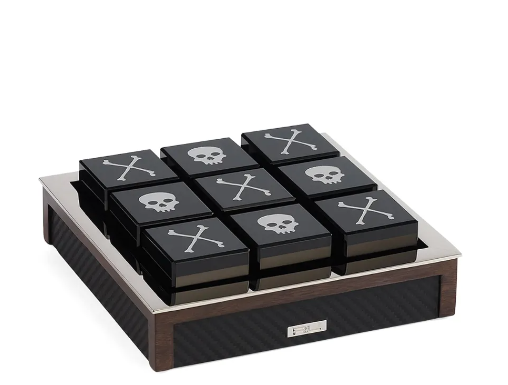 - Kółko i krzyżyk Sutton firmy Ralph Lauren Home został wykonany z drewna orzechowego, skóry oraz z włókna węglowego, a jego elementy pokryte zostały polerowanym niklem.
