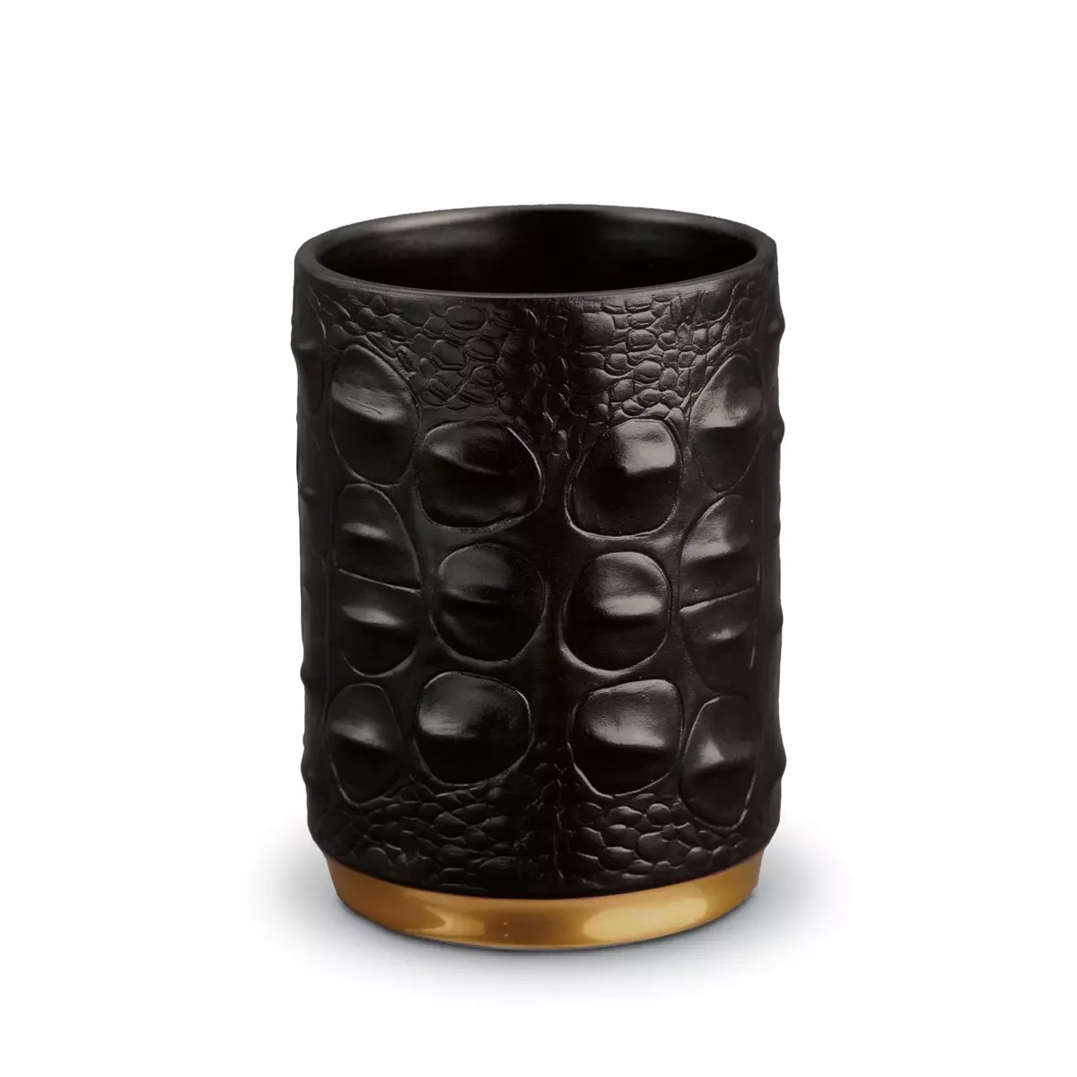 - L'Objet's Crocodile leather-textured pen cup in black is made of porcelain and finished in 24 karat gold.
