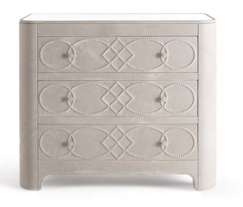 • The Infinity sideboard by Gianfranco Ferré Home is crafted from poplar and finished in a light-colored fabric. It features two drawers with upholstered handles and a top with clear protective glass.