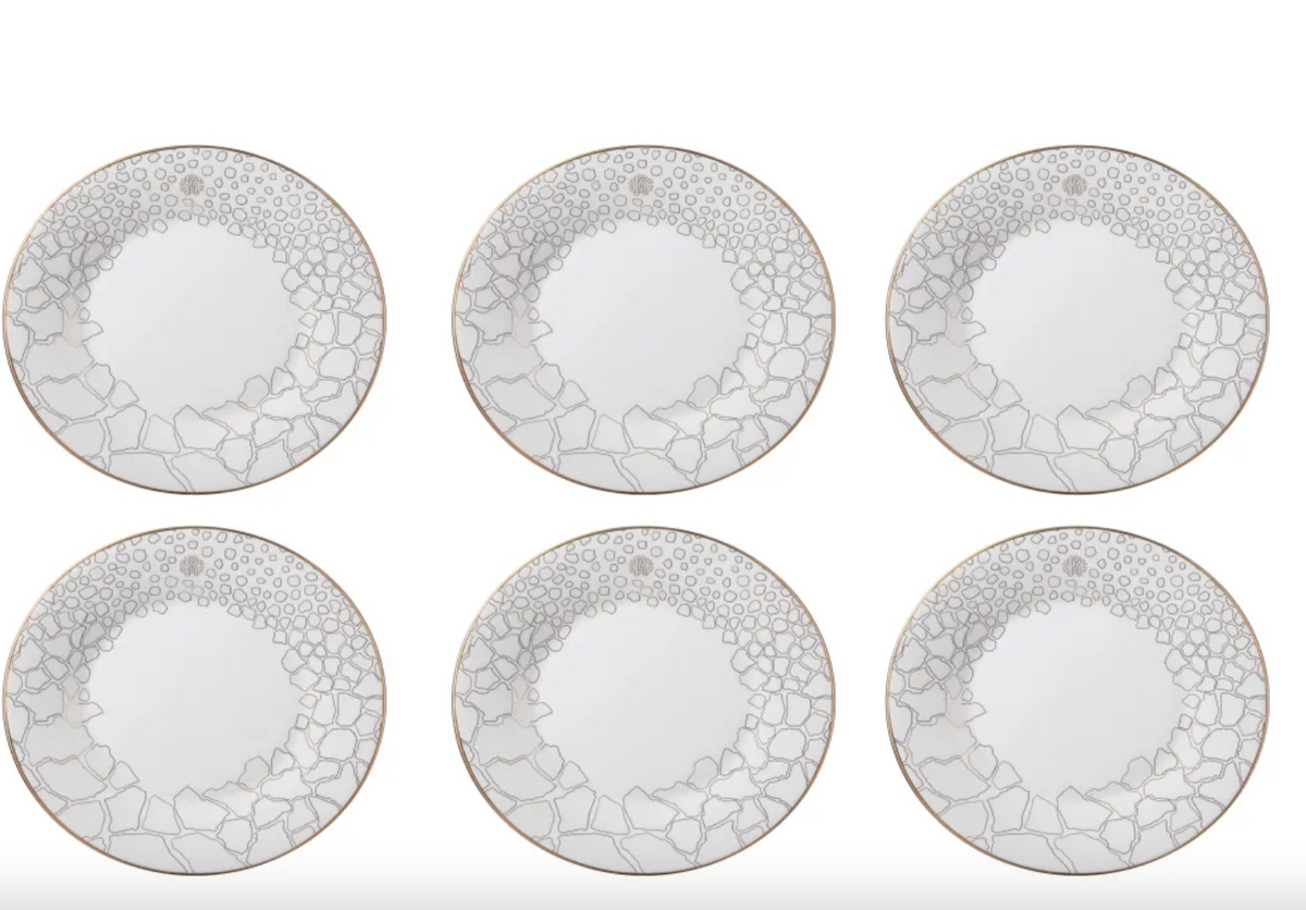 A set of six dinner plates from the Giraffa collection by Roberto Cavalli Home. Crafted from high-quality porcelain, the plates feature a giraffe-inspired design, with distinctive spots on a white background. The pattern's contours are finished in alternating black, gold, and silver, creating an elegant and dynamic effect. The gold rim and repeating Roberto Cavalli Home logo emphasize the luxurious character of the collection, ideal for table settings and interiors with a strong, eye-catching style. Dimensions: Ø 27.5 cm.