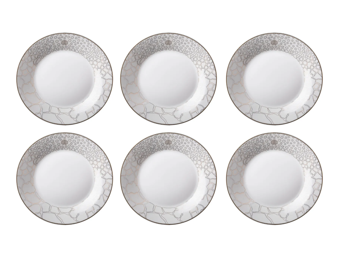 - The set of soup plates was made of high quality bone china. It is distinguished by an inner shell, covered with gold and platinum, reminiscent of giraffe skin, and a monogram embossed inside Roberto Cavalli.