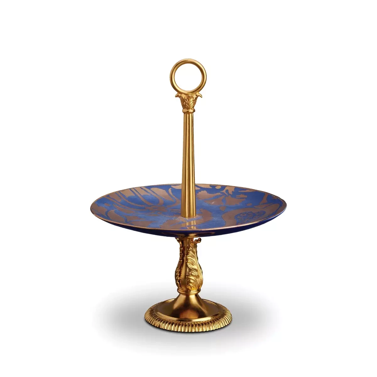 - The Malagrana platter by L'Objet, from the Fortuny collection, is crafted from faience and decorated with hand-applied 24-karat gold accents and a 24-karat gold-plated base. Dimensions: 18 x 24 cm.