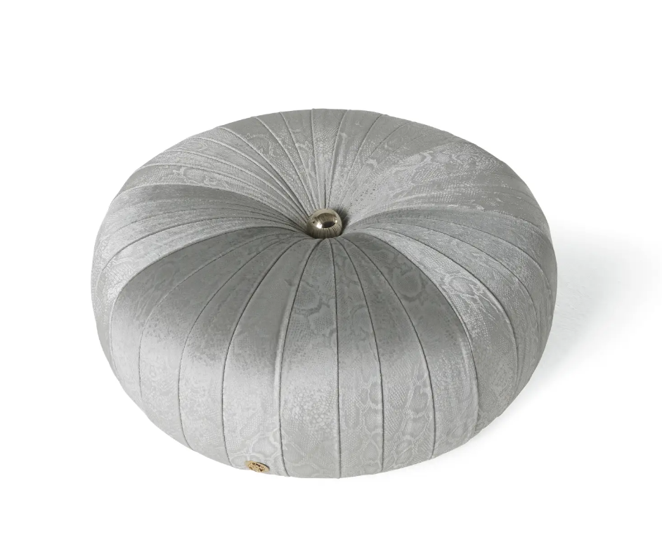 The Sharpei ottoman by Roberto Cavalli Home Interiors is crafted from poplar wood and foam. Upholstered in Category A fabric. The central ball is made of metal in a glossy or brushed finish. Dimensions: ø 92 x H 35 cm.