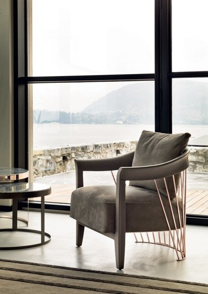 Dorothy armchair by Longhi is made of wood and metal in a chrome finish. Hot bonded leather upholstery. Backrest cushion filled with goose down. Product available in different material finishes. The price quoted is a preview price, changing depending on the type of finish. Dimensions: 75 x 74 x 53 cm