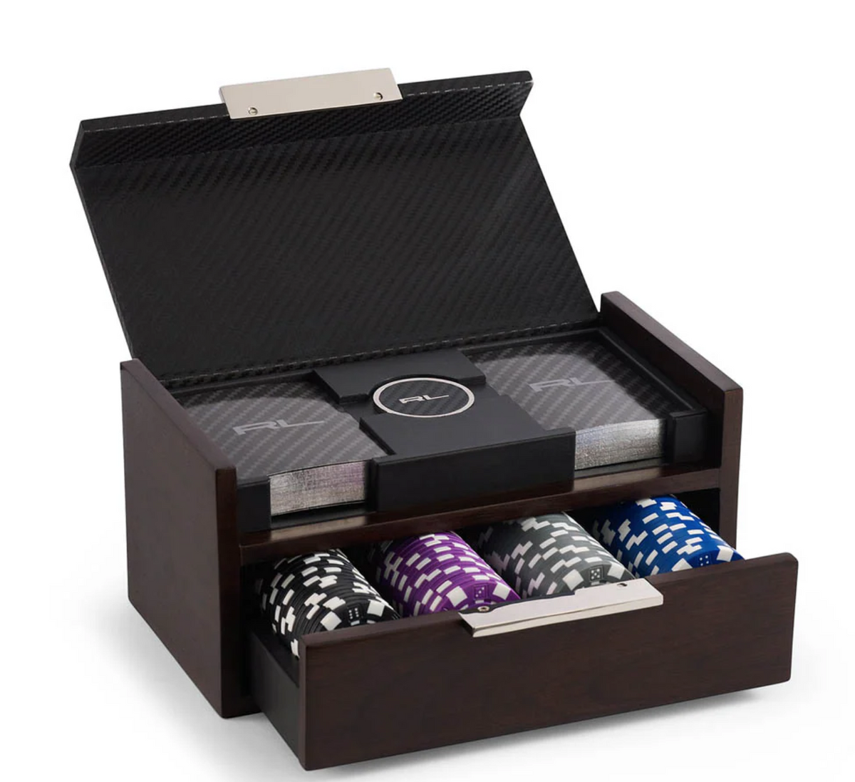 - The Sutton Poker game set by Ralph Lauren Home is made of walnut wood and carbon fiber leather, and is covered with polished nickel.