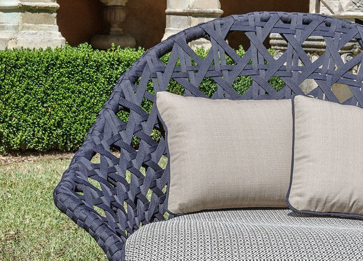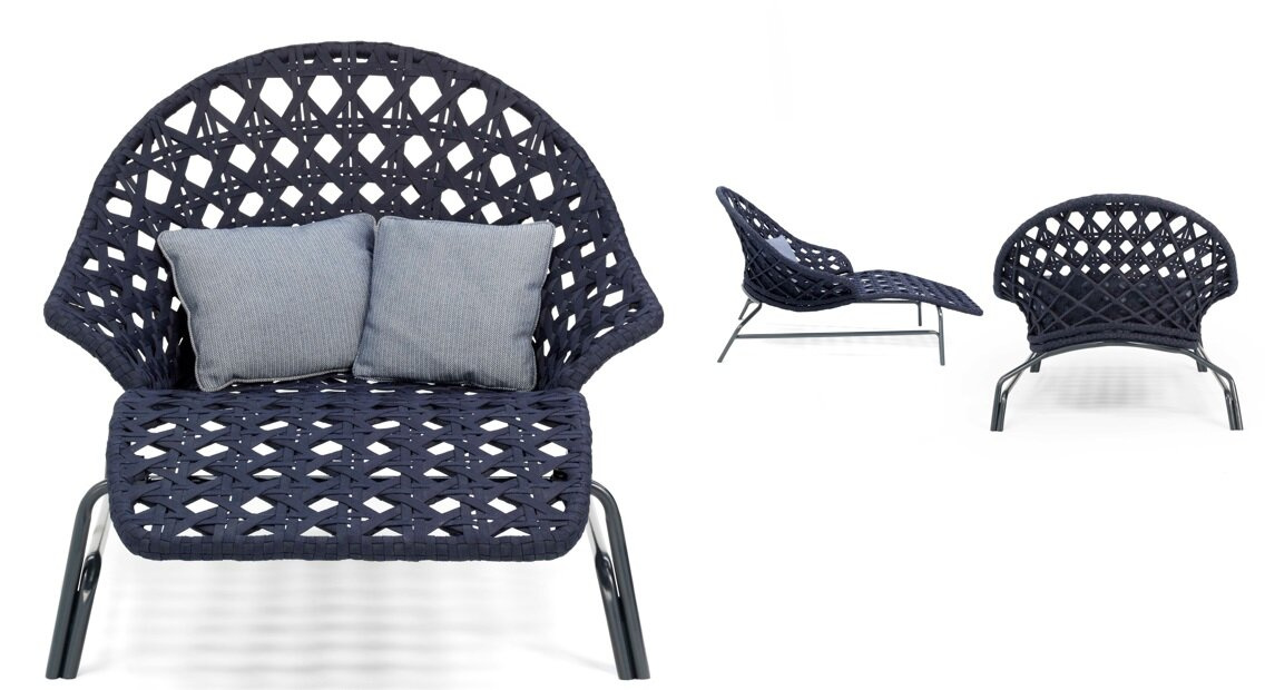 • Evia garden chaise longue by Smania is made of powder-coated aluminum and covered with braided polyester webbing with one 45 × 35 cm cushion. and one 35 × 35 cm pillow.