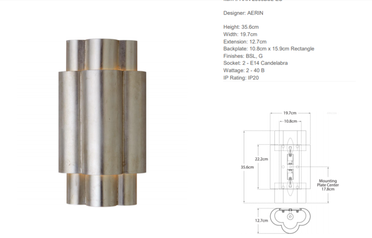 - Arabelle wall lamp by Aerin is made of oxidized silver. The lamp has a socket for an E 14 bulb.
