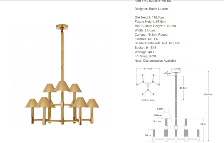 - The Barrett Medium chandelier by Ralph Lauren Home is made of polished nickel. The chandelier has nine sockets for E 14 bulbs.
